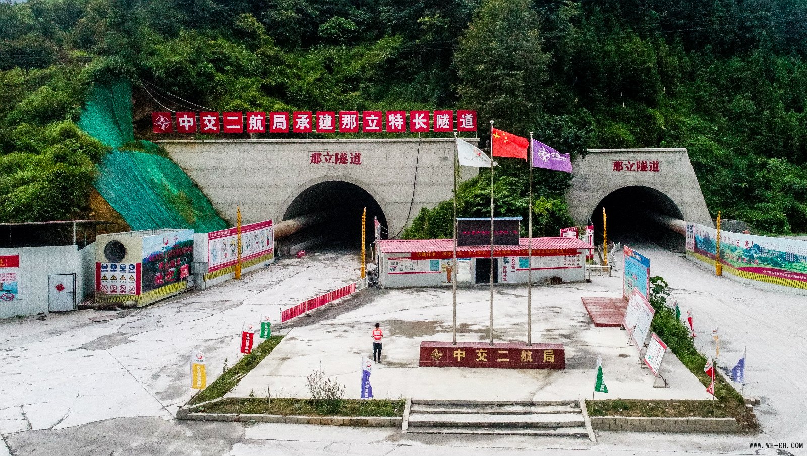 那立特长隧道,左洞长3147米,右洞长3145米,是乐百高速全线八大控制性工程之一,也是二航局承建史上少有的特长隧道。隧道区属于中低山地貌,地形起伏大,且有盘山道路经过。为保护当地生态环境,那立隧道采取“零开挖”进洞的方式,最大限度地保护了洞口植被,而且洞口的外观质量整洁美观。