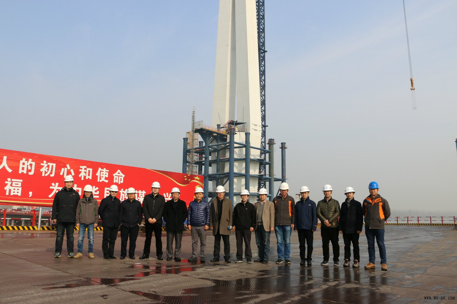 王晓锋一行首先来到南京五桥北塔施工现场,认真听取了工程概况和建设进展情况介绍,并乘坐电梯至北塔下横梁,在现场就南京五桥施工技术创新点和施工过程中的重难点进行了交流。随后一行人步行至北岸码头参观了正在运输的节段梁并集体合影。