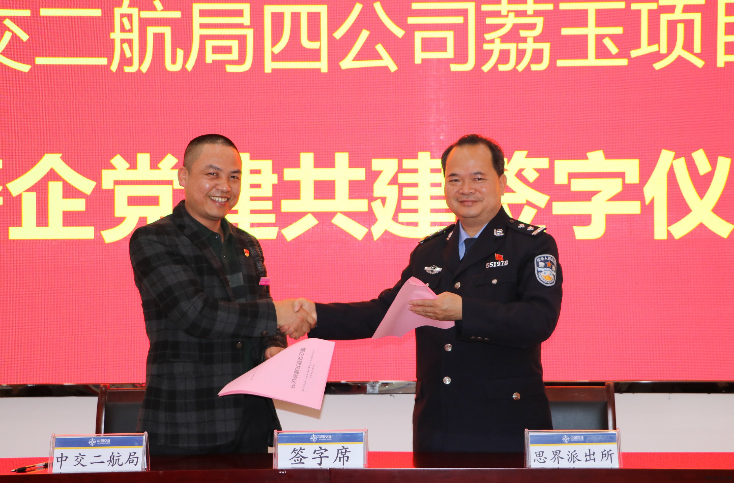 3月14日上午,荔玉高速11分部举行“思界派出所驻中交二航局警务室”揭牌仪式暨警企党建共建签字仪式,思界乡党委书记陈永军,乡长张敏杰,乡派出所所长谢四海等出席仪式,项目部领导班子及各部门员工参加仪式。
