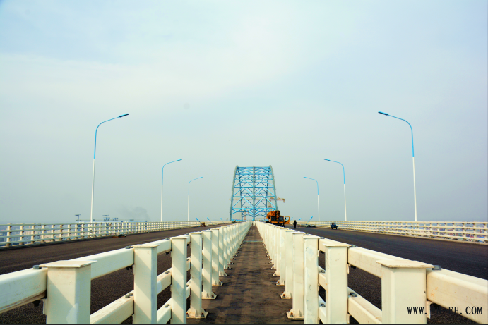 沪通长江大桥公路桥面的路灯采用下白上蓝的配色,正桥灯杆高12.5米,下面8米是与公路防撞护栏颜色一致的LS-101白色,上面部分是与钢桁梁面漆颜色一致的天酞蓝,整体搭配起来则如蓝天白云一样和谐,自成一道风景线。