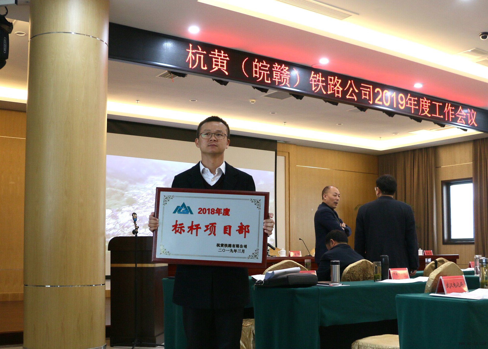 3月26日,在杭黄(皖赣)铁路公司2019年度工作会暨表彰大会上,公司杭黄铁路站前Ⅴ标项目部作为先进集体代表,作了经验交流,获得2018年度“标杆项目部”称号,另有两名建设者分别获得“建设先锋”、“技术能手”等荣誉称号。杭黄、皖赣铁路各参建单位的近百名有关人员参会。