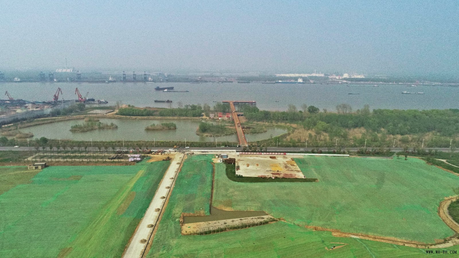 远处清澈的江面泛起层层波纹,沿岸的防护林在微风中轻轻摇曳,工地现场有条不紊进行施工。中交二航局南京仙新通道XD-1标段正在用一系列安全环保施工工艺谱写一幅恬静优美的施工大画卷。