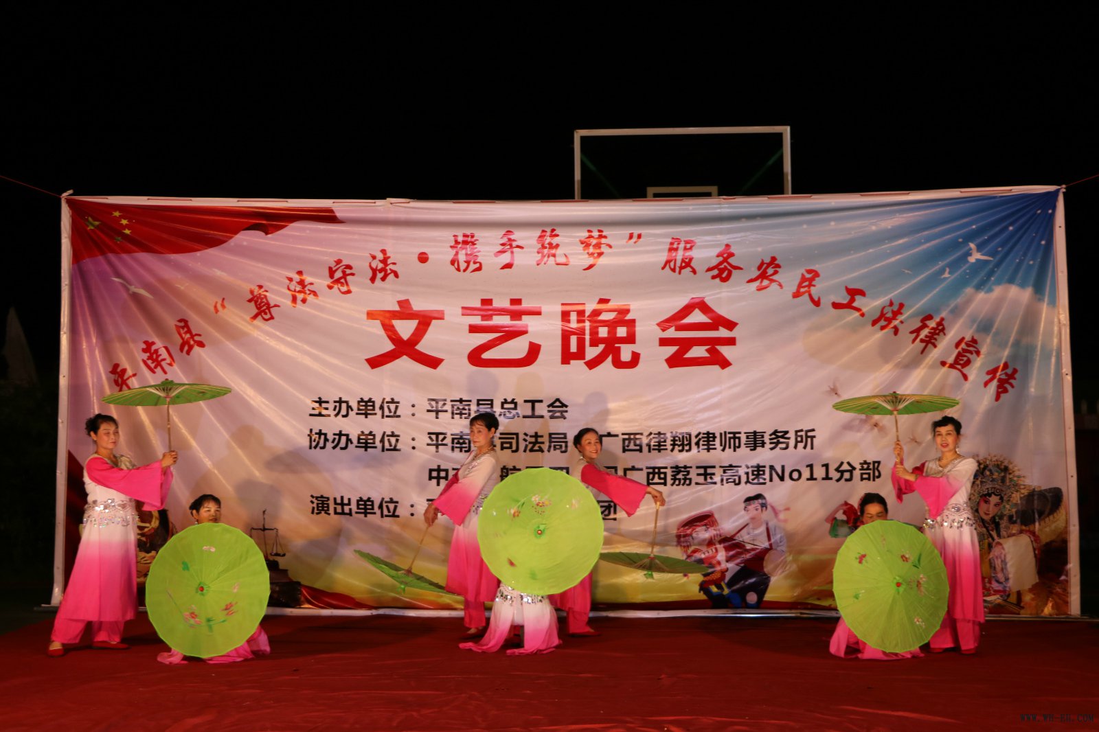 此次文艺演出的主题为“尊法守法·携手筑梦”,平南县总工会联合平南县司法局、广西律翔律师事务所深入荔玉高速一线,以农民工喜闻乐见、接地气的方式,开展农名工维权法律服务活动,增强农民工的法律意识,丰富一线职工的精神文化生活。主办方还为现场人员准备了“礼包”,演出前,平南县总工会副主席彭凤莲为大家发放农民工维权宣传手册。