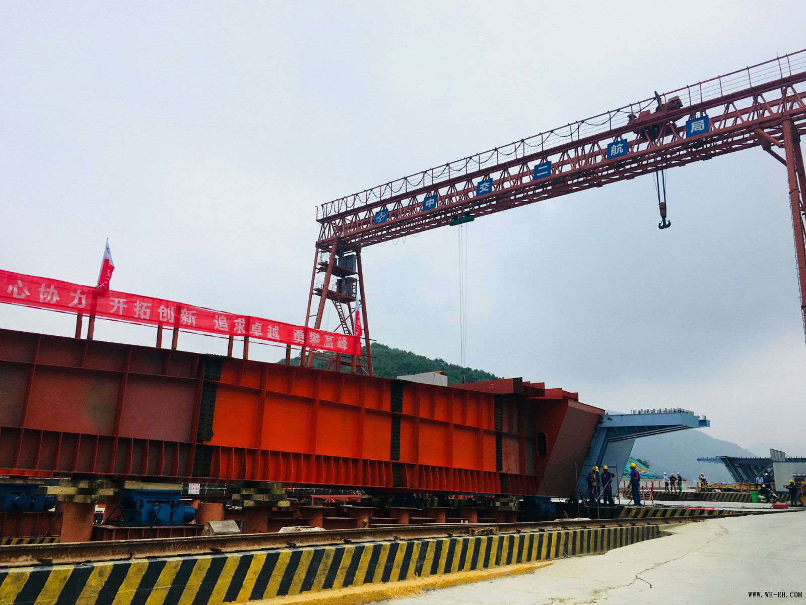 5月13日,由中交二航局承建的沙埕湾跨海大桥南引桥首片钢槽梁开始进行顶推施工。