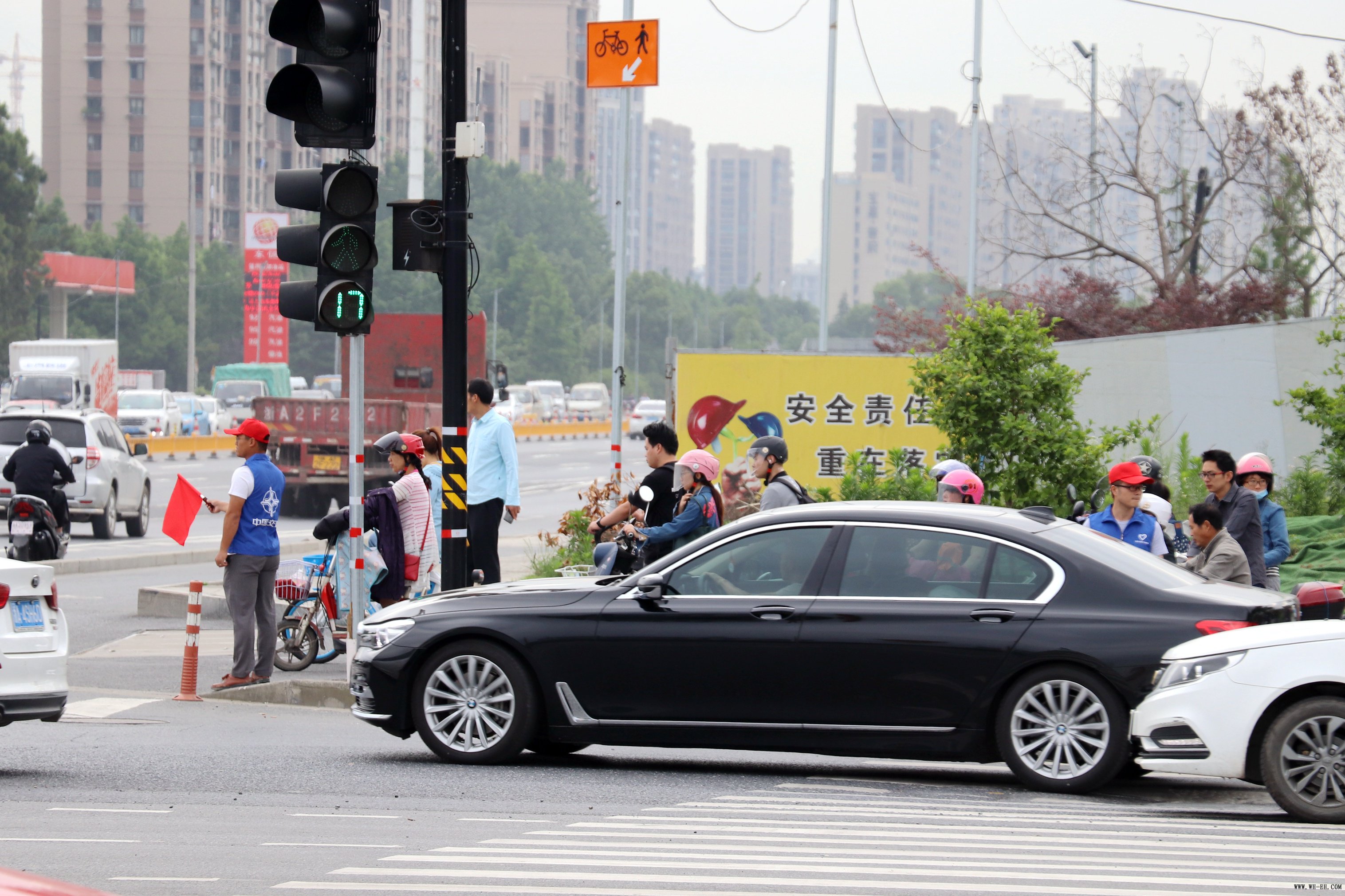 “请不要着急,安全第一,等绿灯亮了在走……”“电瓶车请走非机动车道”在杭州市石祥西路与花蒋路交汇处的四个路口,身穿蓝马甲头戴小红帽的志愿者分列道路两侧,于斑马线处劝导交通。每当红灯亮起,他们就会举起手中的小红旗,示意行人、电动车止步。