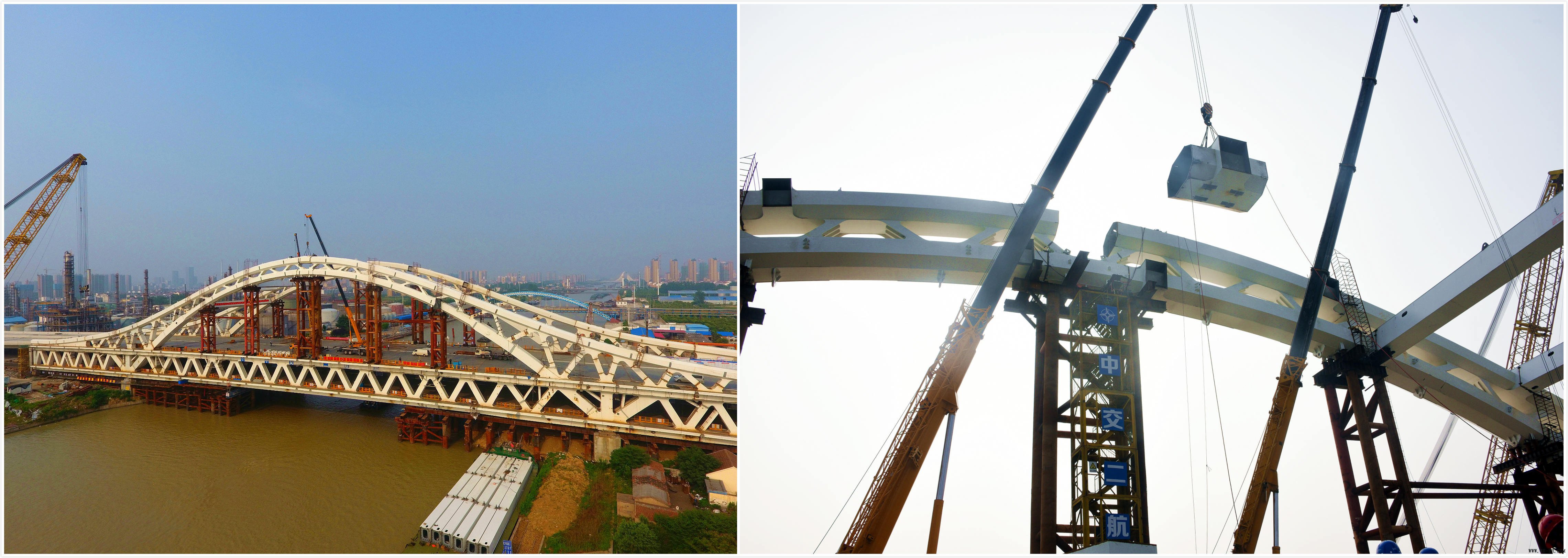 大桥主体为桁架拱体系,上部横向设有两片拱圈。拱圈共由34块拱肋拼装组合成,拱圈整体成抛物线弧度。拱肋由厂内制造并进行预拼,后经水路运输至桥位进行安装,现场采用浮吊与汽车吊相结合的方式吊装。为确保合龙精度,合龙前,项目部连续三天进行观测,确定合龙温度下合龙口的实际间距,并不间断地对四个合龙段依次安装。