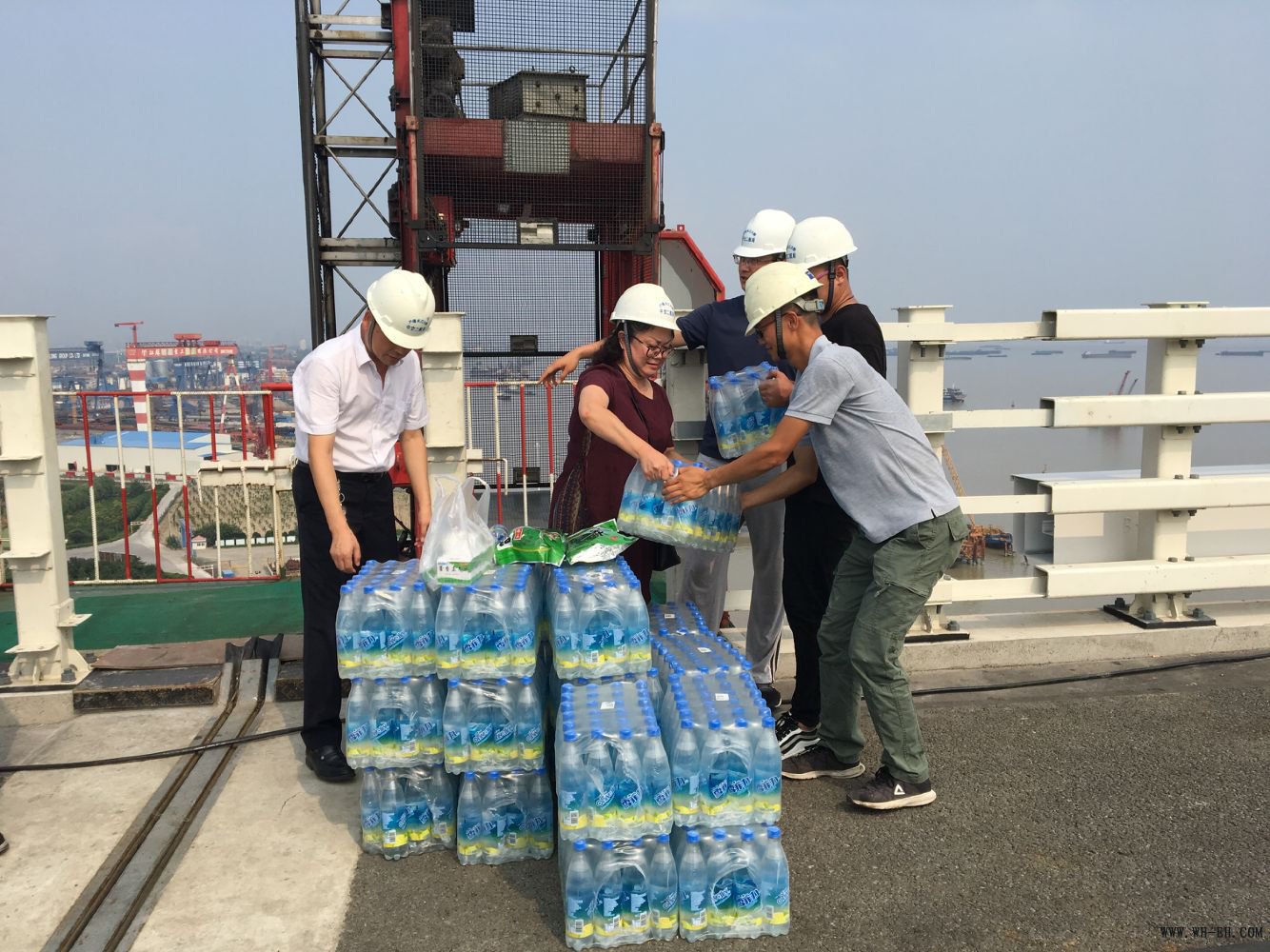 7月23日,为慰问大暑天气下的一线建设者们,项目部书记(兼安全总监)和工会主席来到了施工一线,为施工班组和工地管理人员送来了冰镇盐汽水、茶叶、藿香正气水等消暑降温用品。除了发放到位的解暑利器,同时送到的还有谆谆关怀——安全总监再三叮嘱现场施工人员,保障项目进度虽重要,但“安全第一”的理念要时刻牢记,要劳逸结合,避开最高温时段,合理安排施工时间,注意休息保证健康,才能更好地为大桥建设出力。