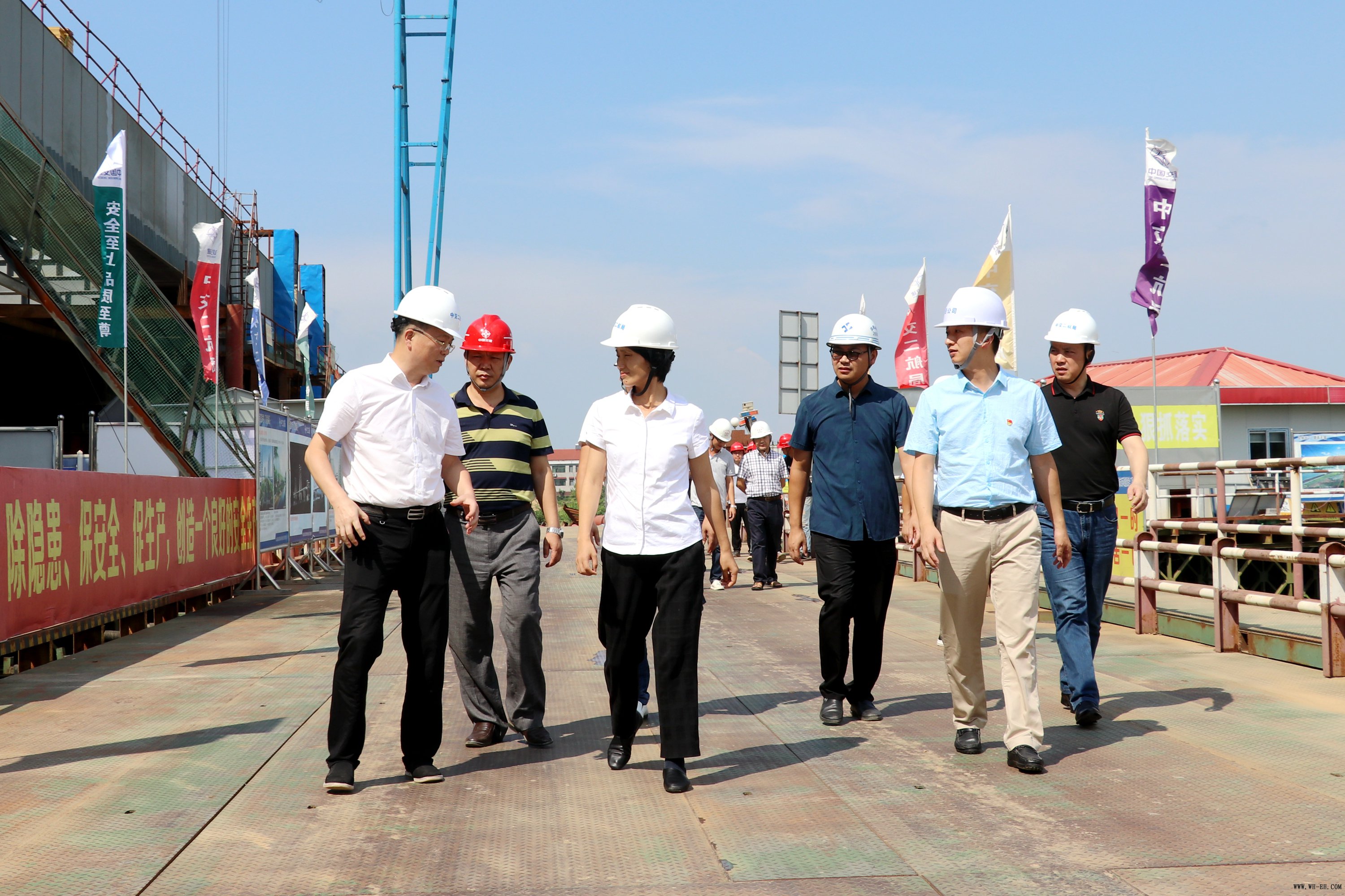 项目负责人为杨爱云一行介绍了青龙洲大桥的工程概况和施工进度。杨爱云在考察过程中对二航局的安全生产标准化建设与安全教育工作表示了肯定。当了解到大桥产值已完成过半,钢箱梁顶推将于12月底前完成时,杨爱云赞赏道:“在中交二航局这里,我看到了大型央企的实力和魄力!”