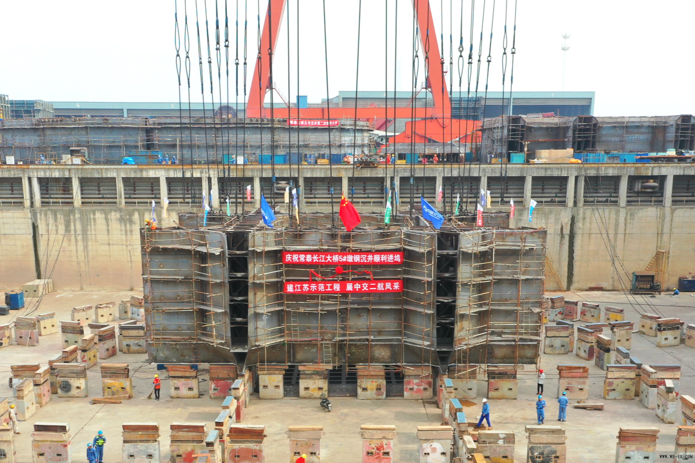 5号钢沉井为目前世界上最大的水中沉井,总重1.8万吨,分为8层共64米,底部5层共43米,沉井底面尺寸95.0×57.8米;沉井顶面尺寸77.0×39.8米。首创采用“上小下大”的台阶式造型,可降低沉井重量,有效阻挡下潜水流,减少冲刷,减少埋置深度。