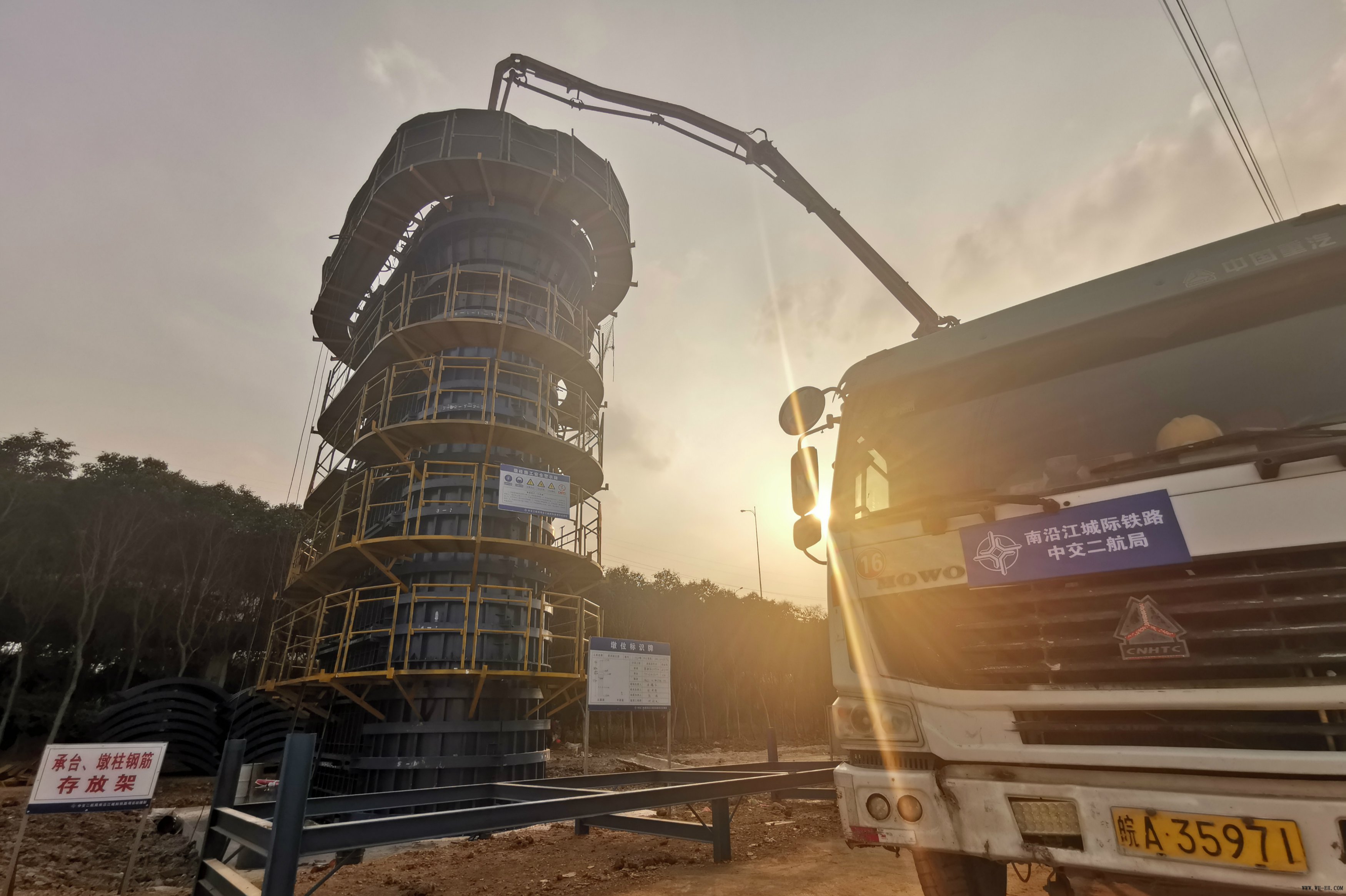 11月3日下午,经过9个小时的紧张作业,南沿江城际铁路首个墩身顺利完成混凝土浇筑施工。