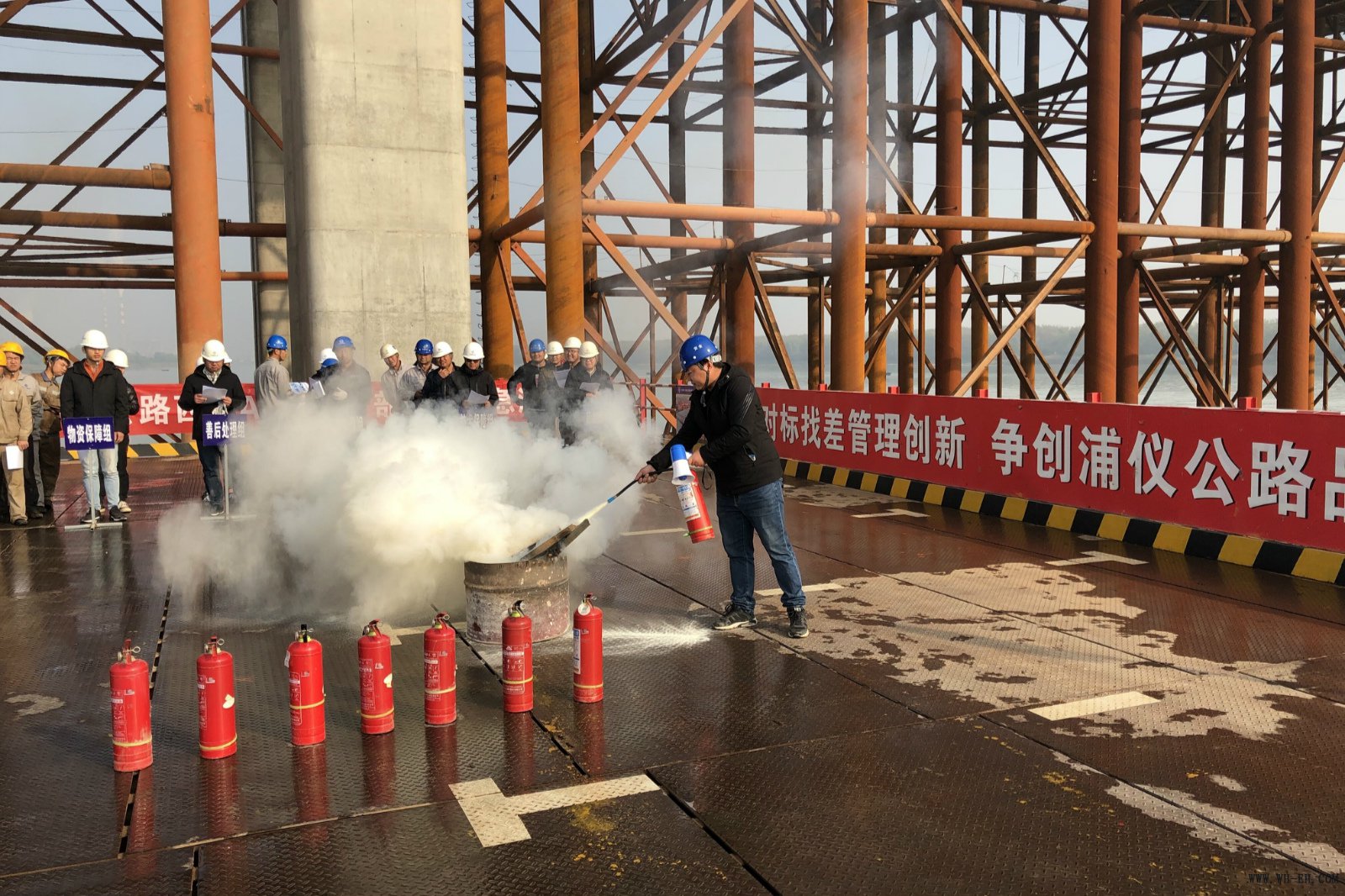 在这个特殊的日子,项目部组织开展了施工现场消防安全应急演练。参加演练的人员分成6个小组,抢险救援组、信息沟通组、技术保障组、后勤保卫组、物资保障组和善后处理组。上午9点,参加人员按照小组在浦仪大桥水上17号墩工段处列队站好。项目部安全总监何晨光主持这次演练。何晨光首先对照灭火器详细介绍灭火器的种类、各部件的名称和使用方法。随后何总监一边讲解一边演示,按照灭火器使用步骤逐步分解,教授给所有人员灭火器的正确使用规范。对准事先设置好的火源,何总监按压灭火器,传来呲的一声,火源随之熄灭,却点燃了参加人员学习的热情。纸上得来终觉浅,绝知此事要躬行。只是知道灭火器的使用方法可不行,参加人员按照排队练习使用灭火器,实打实地用灭火器灭了一次火。所有人员实践后,何晨光向众人介绍了防火的相关知识和自我保护的一些举措后,宣布演练圆满结束。