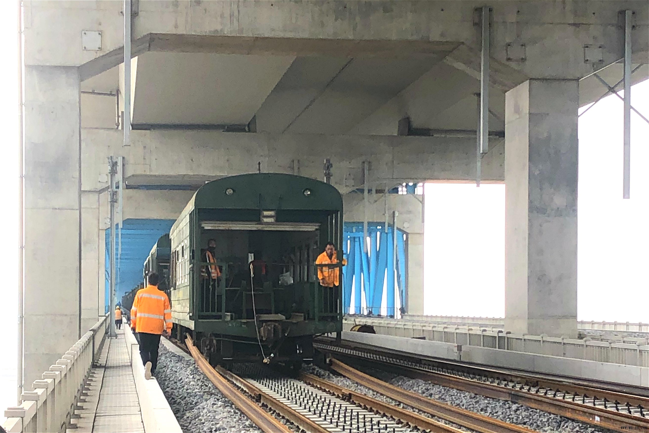 为达到轨道铺设任务目标,合理利用机械设备,提高施工效率,施工单位不断优化施工组织,积极沟通施工方案,进行了详细布置和优化。在铺轨作业进行之前,已经在铁路层的钢桥面上铺设了具有保护钢桥面和承载轨道作用的道砟。此番铺轨采用机械化大型作业设备,从南通西站方向驶上大桥,将轨道铺设到道砟上。