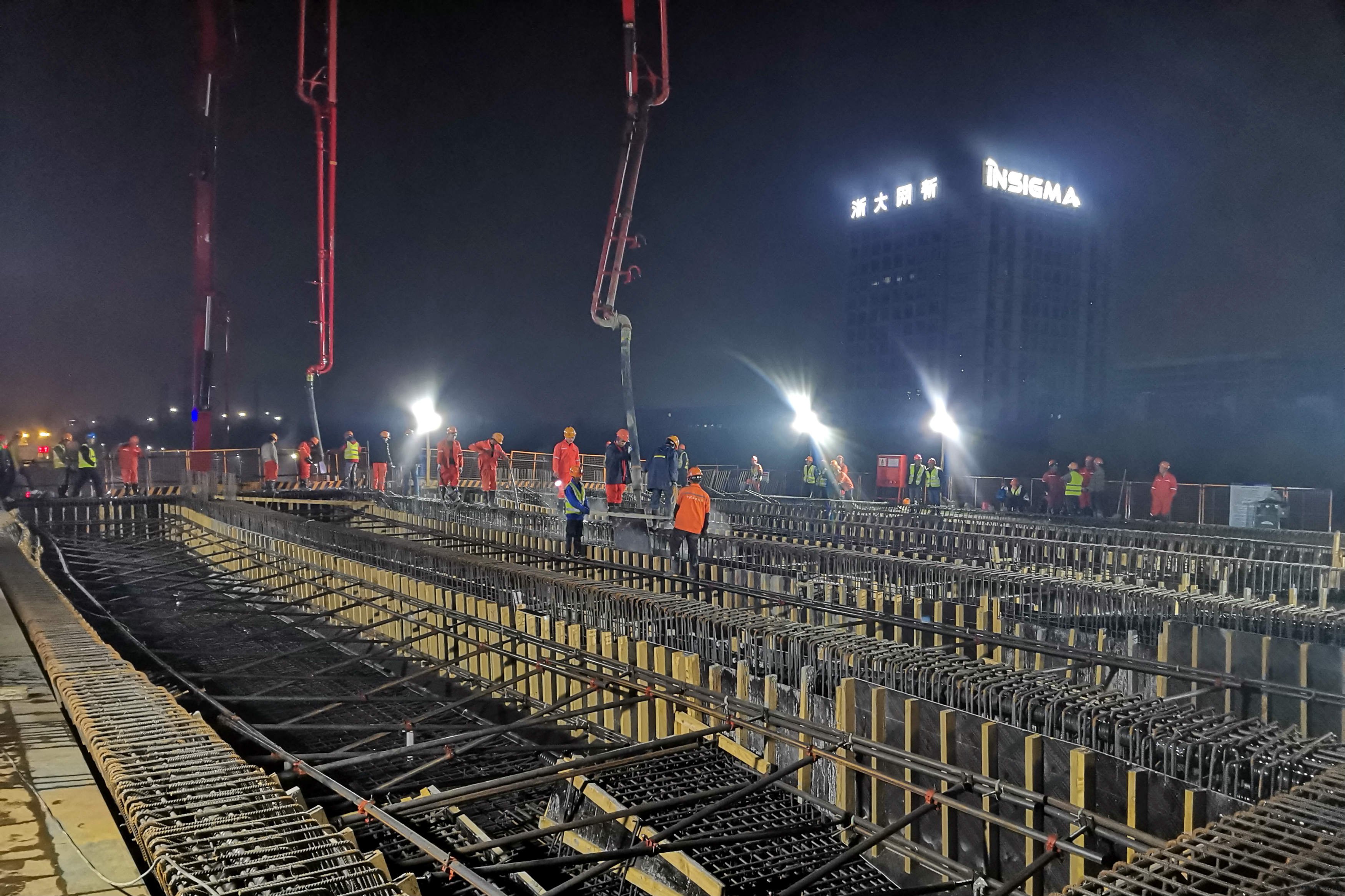 为保证此次混凝土浇筑的圆满完成,项目部共投入2台天泵、25辆混凝土罐车(早晚交通高峰限5辆)、60余名作业人员分两班进行作业,顺利完成送料、振捣、抹面等工作。在项目部全体员工的通力协作和共同努力下,经过28小时的不间断施工,加班加点,相互鼓舞,勇于向困难亮剑。最终,顺利完成了本次混凝土浇筑工作。