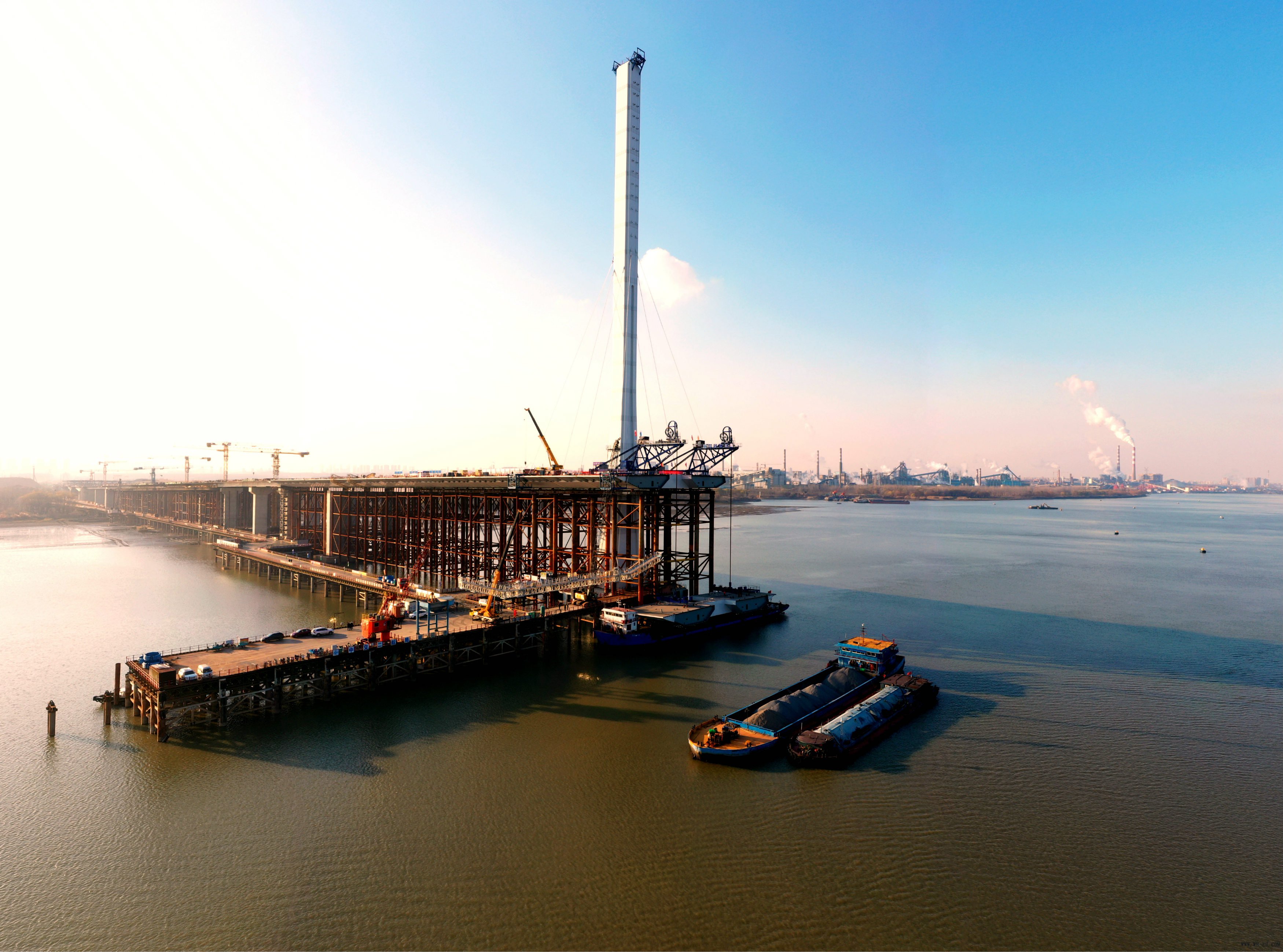 随着新一轮寒流的到来,下午3时40分,寒风料峭的夹江江面上,施工人员在六十多米高的主塔0#墩吊装平台,进行吊装前的准备工作。运输首榀钢箱梁的翔运118#平驳船,在现场指挥人员急促哨声中缓慢靠近桥位。起吊平台的上下游各排列着一台崭新的桥面悬臂吊机,悬臂吊机庞大的吊臂伸向大江之上,在吊臂顶端从高空长长垂下的吊具此刻静静等待着。