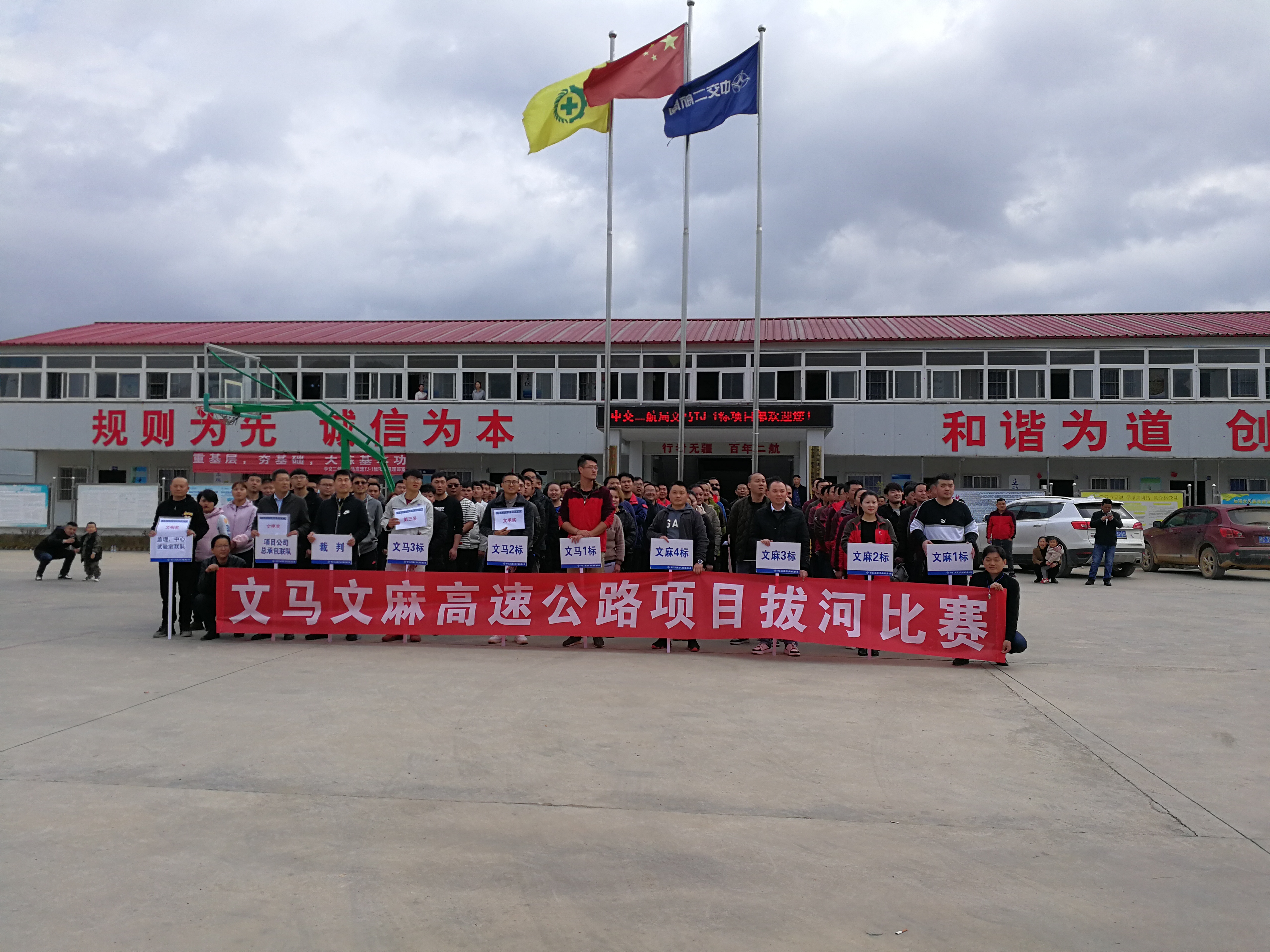 2020年1月1日上午,项目部组织10名员工参加了中交二航局文马文麻高速公路项目拔河比赛,本次比赛以“团结奉献勇拼搏,共创文马文麻新篇章”为主题,以丰富职工业余文化生活,激发员工拼搏进取的企业精神为宗旨,透过拔河比赛,加强部门及员工之间的交流与合作,发扬团队精神,增强员工的凝聚力和向心力。全体参赛人员纷纷以极大地热情参与到此活动中。