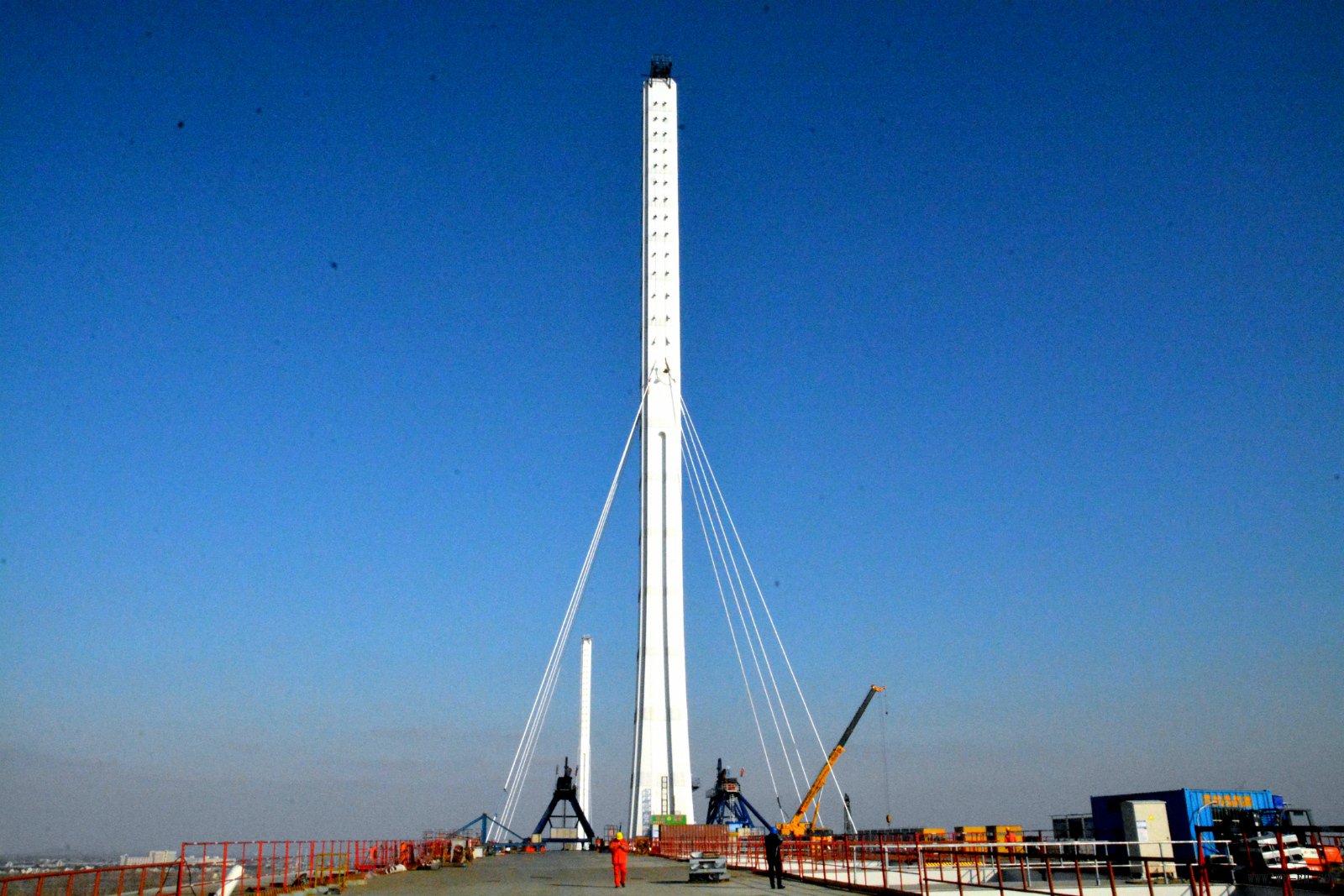 1月6日,主桥施工人员完成了第二节桥面钢箱梁起吊施工。在准确就位并焊接完工的钢箱梁上,斜拉索挂索作业立即展开,通过起重机械高大的吊臂和卷扬机进行辅助,对挂索进行牵引和调整,并利用独创的斜拉索防扭转施工工艺和技术,精准地将2#块钢箱梁牵引斜拉索入锚。