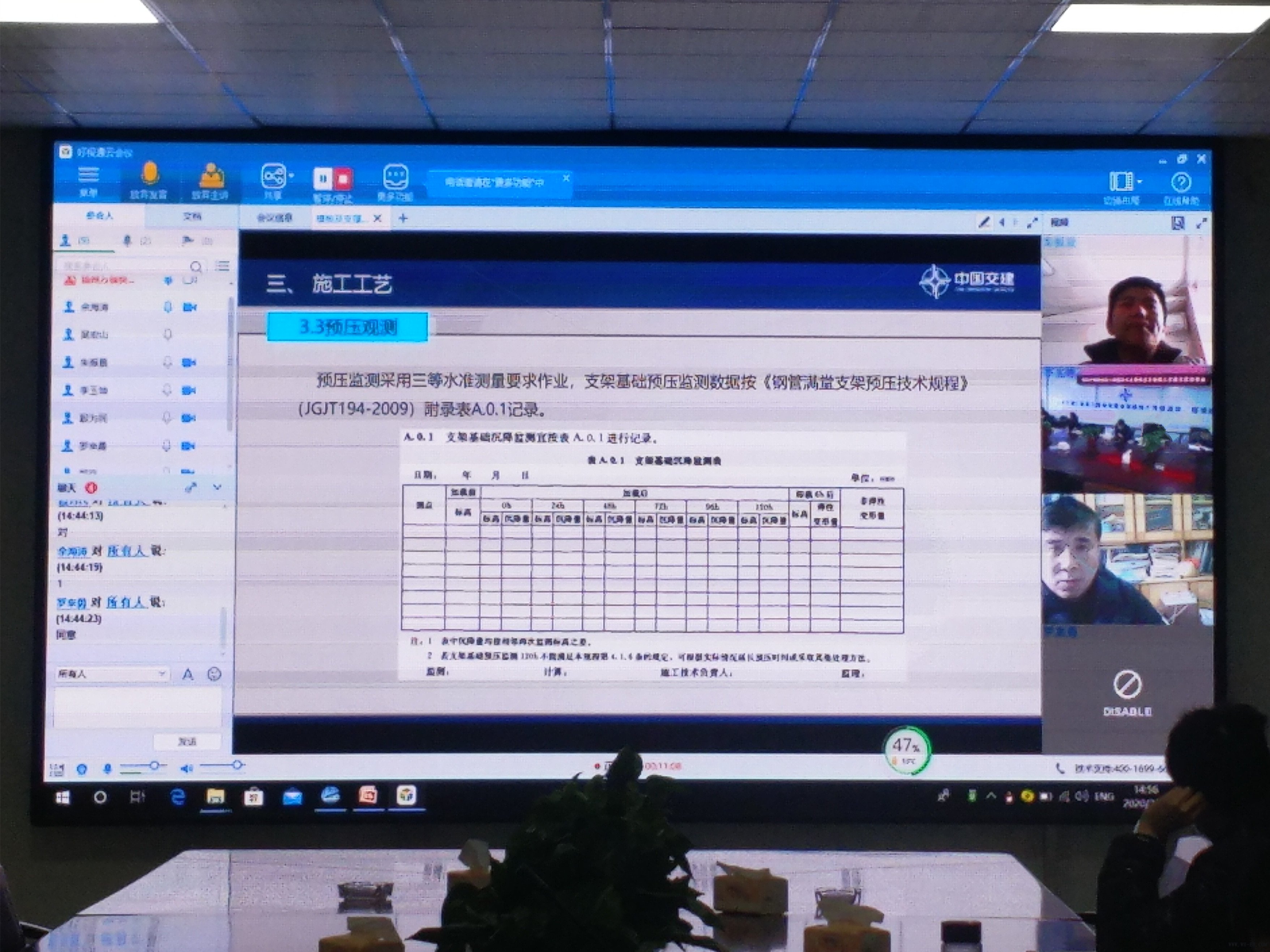 当天下午,专家组、业主单位、监理单位、设计单位及项目部,纷纷“上线”,项目部工程部长李玉坤做起了方案汇报的“直播”,从工程概况、编制说明、施工工艺、安全保证措施、劳动力投入计划、检查验收、应急救援处置等方面对施工方案进行全面介绍。评审专家通过在线审阅、提问和讨论,给出了论证意见,表示方案总体内容齐全,方法可行,经修改后可以用于指导施工,并建议细化基础检测方法及手段,完善监控监测措施等。
