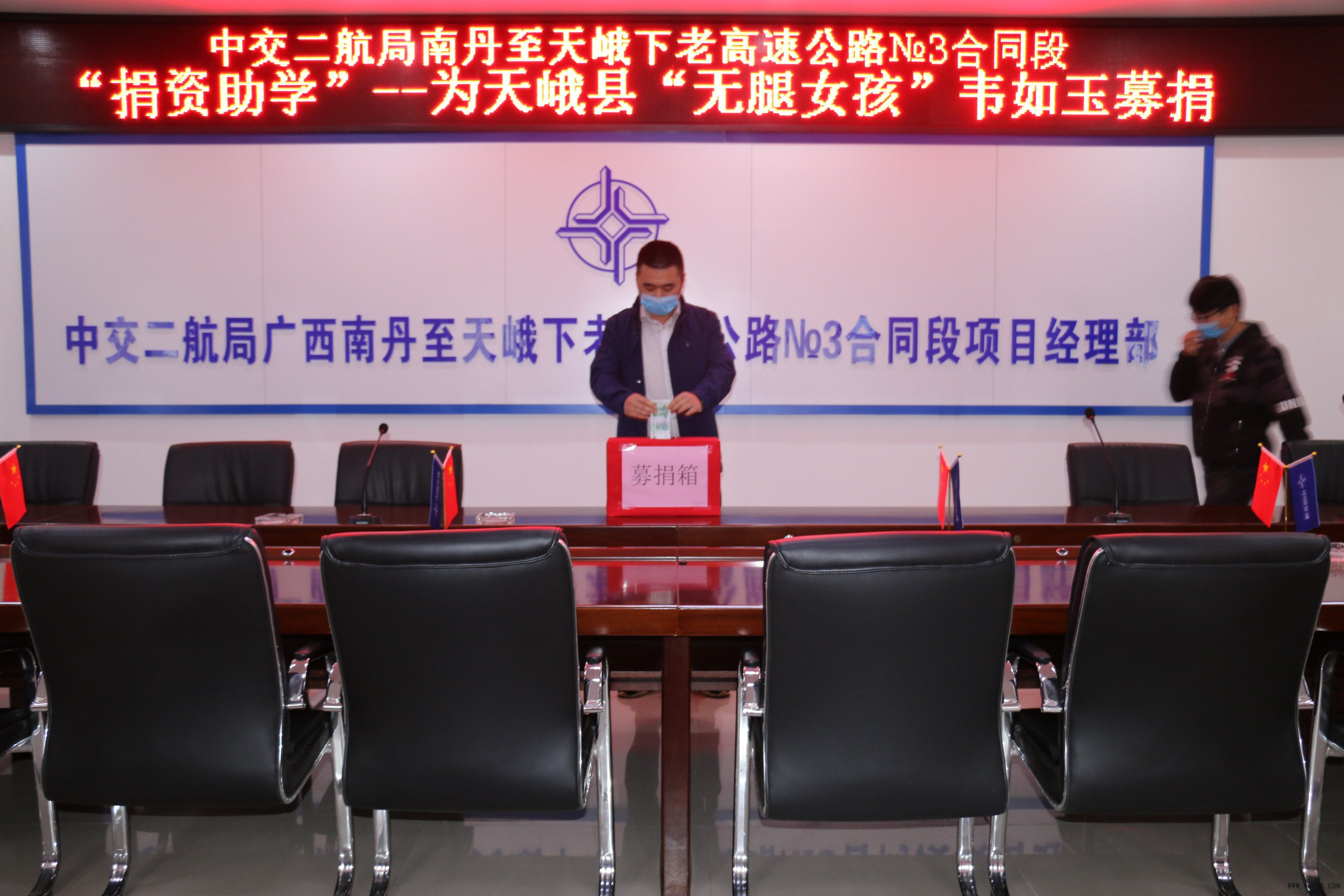 3月2日,公司南天高速公路№3标项目部组织员工开展了“将爱汇聚”爱心募捐活动,为天峨县“无腿女孩”韦如玉送上了一份爱心。
