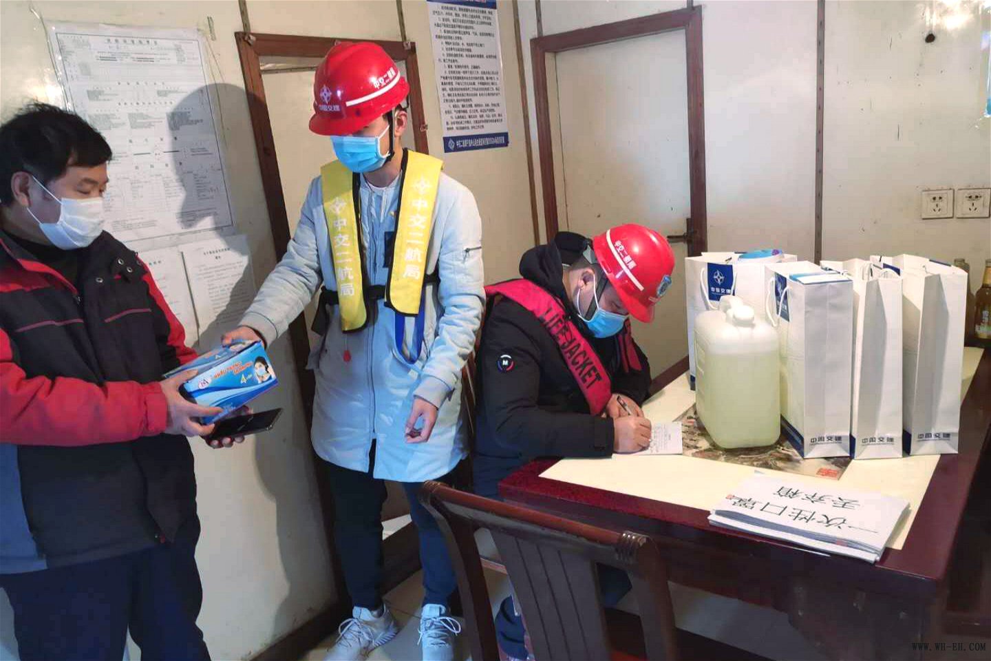 同时,项目部切实做好船舶防疫工作。项目部共有三个工区,五个作业点,每个工点都需要用船将节段梁运送至施工现场,船舶便成为梁场与作业点、项目部驻地与作业点之间的移动“联络站”。鉴于日本“钻石公主号”邮轮上疫情快速传播案例以及船舶本身的密闭特性,船舶疫情防控成为整个防疫过程中的重难点。船员绝大部分时间都在船上,空气流动性差,人员接触频繁,为进一步防控疫情,项目部针对重点船舶如交通船开展全面的疫情防控管理。每位管理人员负责5艘船舶的日常管理,要求各个船舶做好每日体温检测、船舶每日消毒工作。每艘船舶作为一个防疫单位,设置专用的隔离室、物资储藏室、垃圾分类配置垃圾桶,建立起系统的疫情防控体系。