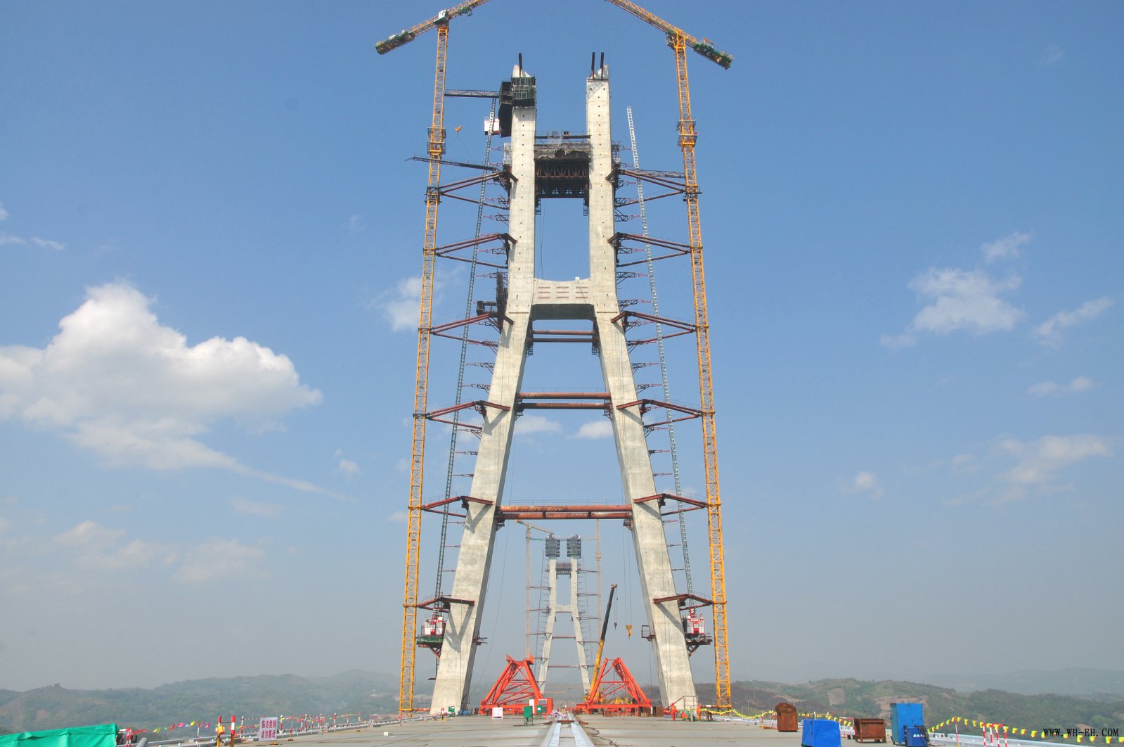 大桥主塔采用花瓶形桥塔,断面为空心箱型,主要施工包括桩基基础、承台、塔座、塔柱、横梁、塔冠、装饰块、钢锚梁等。大桥主塔相当于68层楼的高度,均采用液压爬模工艺进行节段混凝土浇筑施工,其中,南主塔高192.2米,单个塔肢共44个节段;北主塔高189.4米,单个塔肢共43个节段。