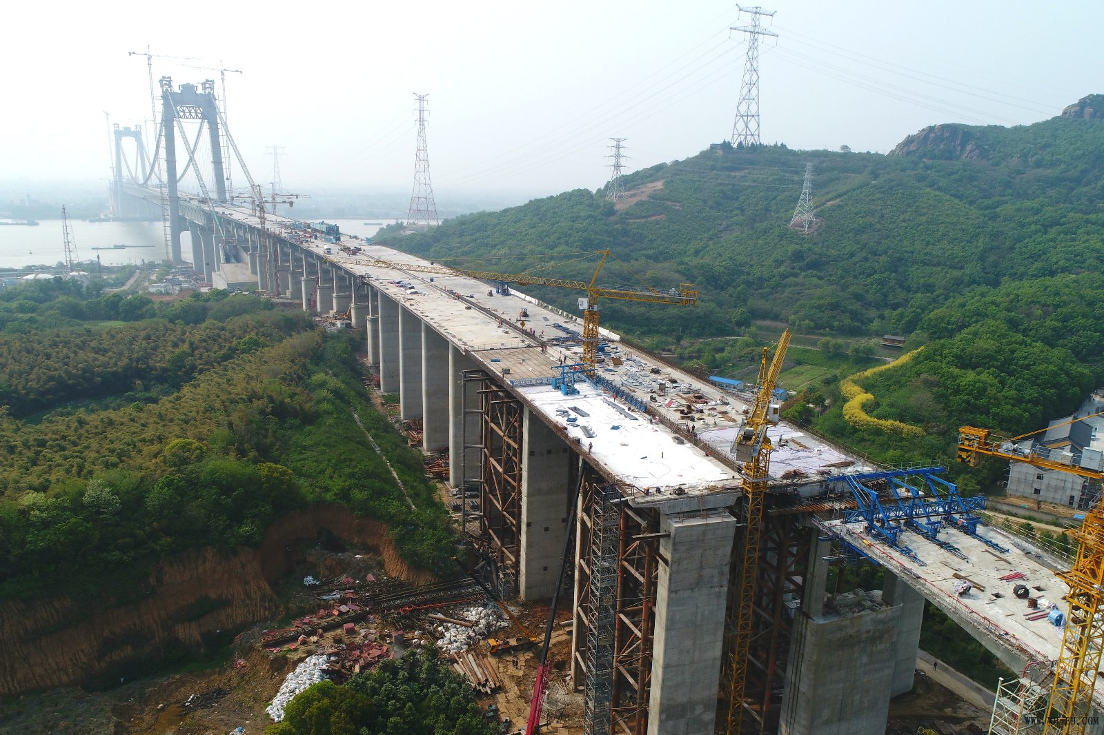 五峰山接线WFS-4标南北引桥涉铁段是全线控制性节点,日前,南引桥涉铁段支架现浇已完成,挂篮施工已完成34节,完成比67%,北引桥涉铁段已完成左幅节段梁安装,桥机变幅施工正在进行。
