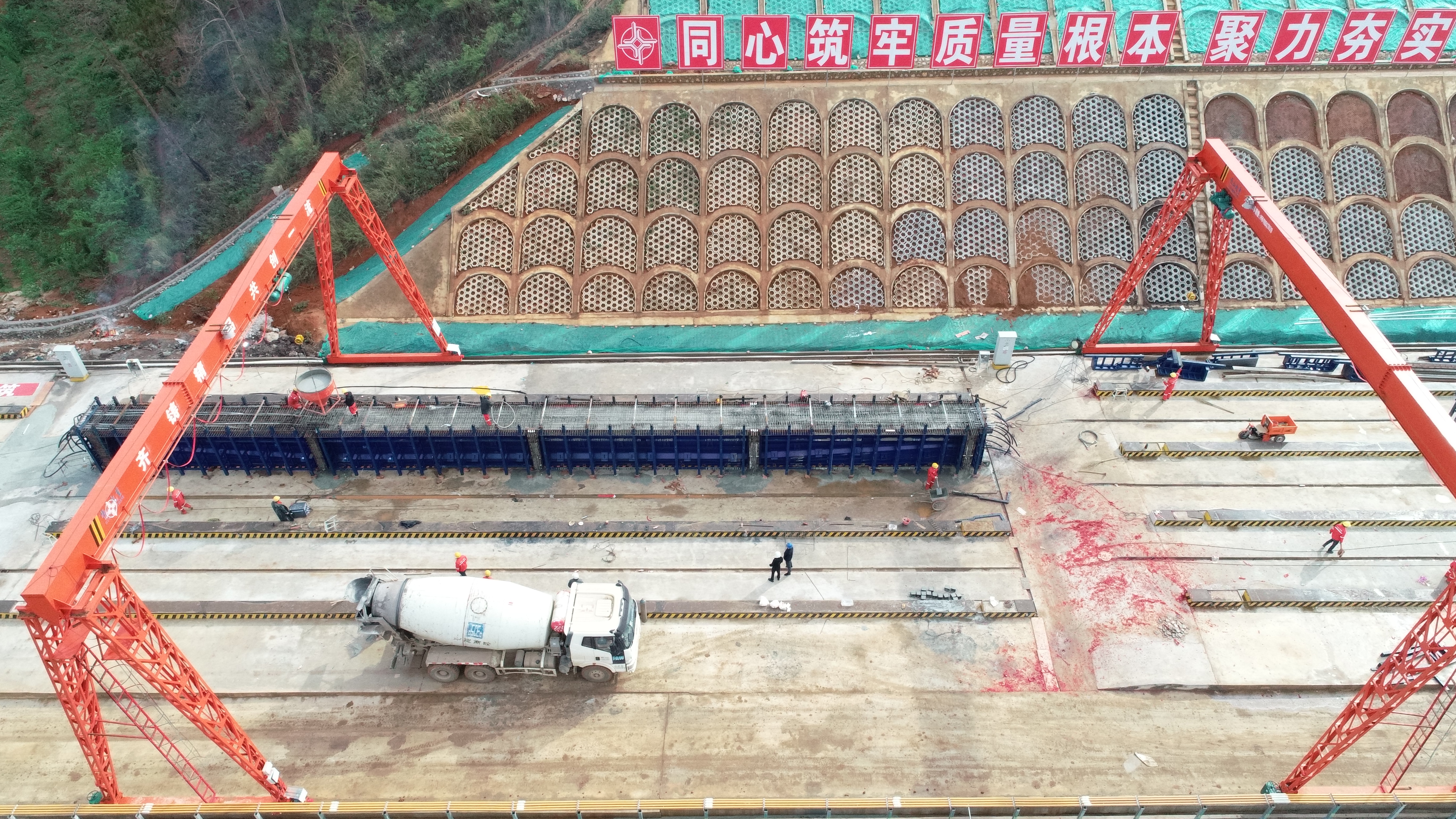 项目部完成的首榀T梁是甲马石枢纽B匝道大桥13-2号T梁,梁长39.143米,重127吨,设计方量49.29方,累计浇筑7个小时完成预制。