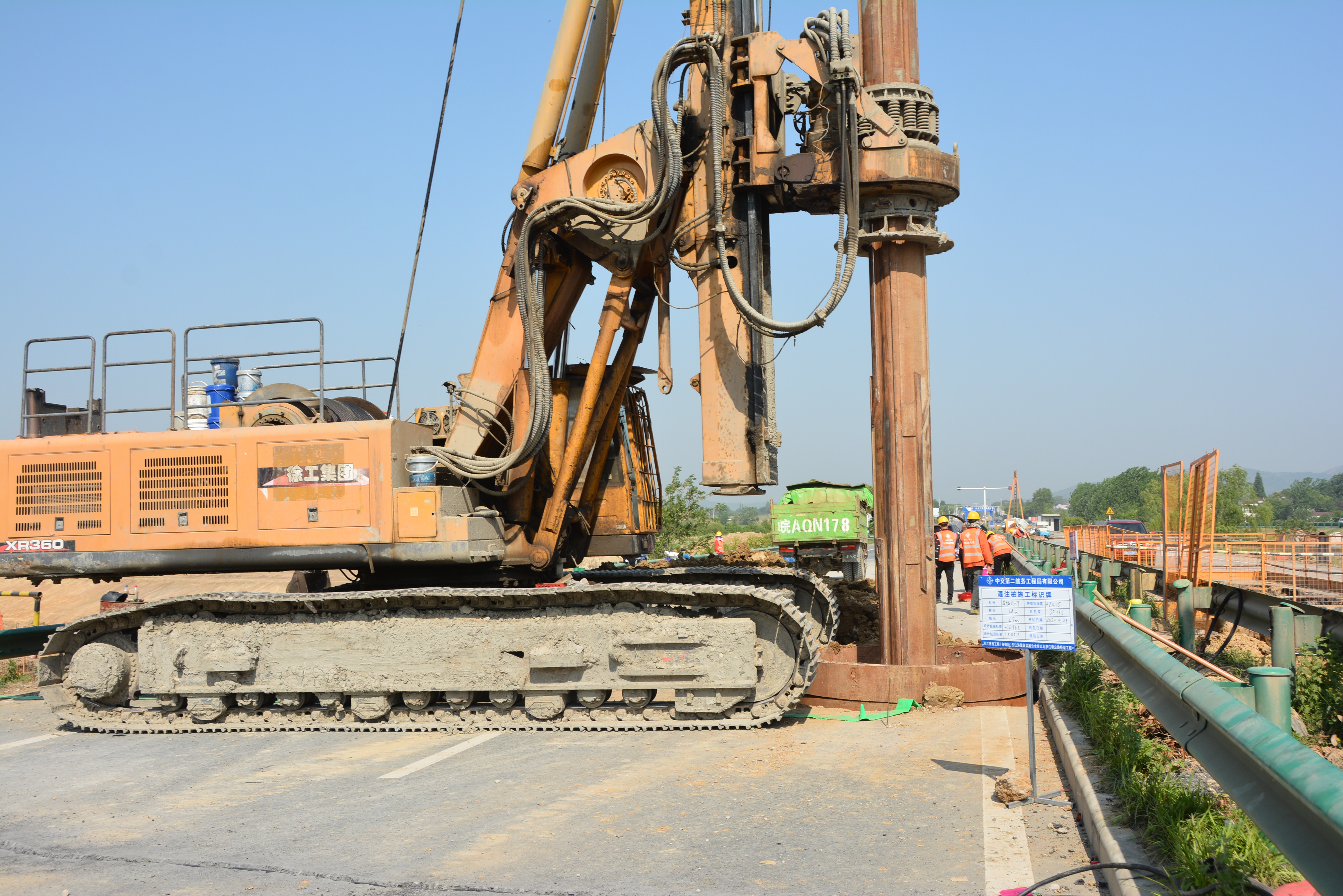 S319新线桥及接线工程共有钻孔桩116根。此次开钻的为S319新线桥11号右幅主墩钻孔桩,桩径1.8米,设计桩长25米,总孔深37米,采用旋挖钻机施工。