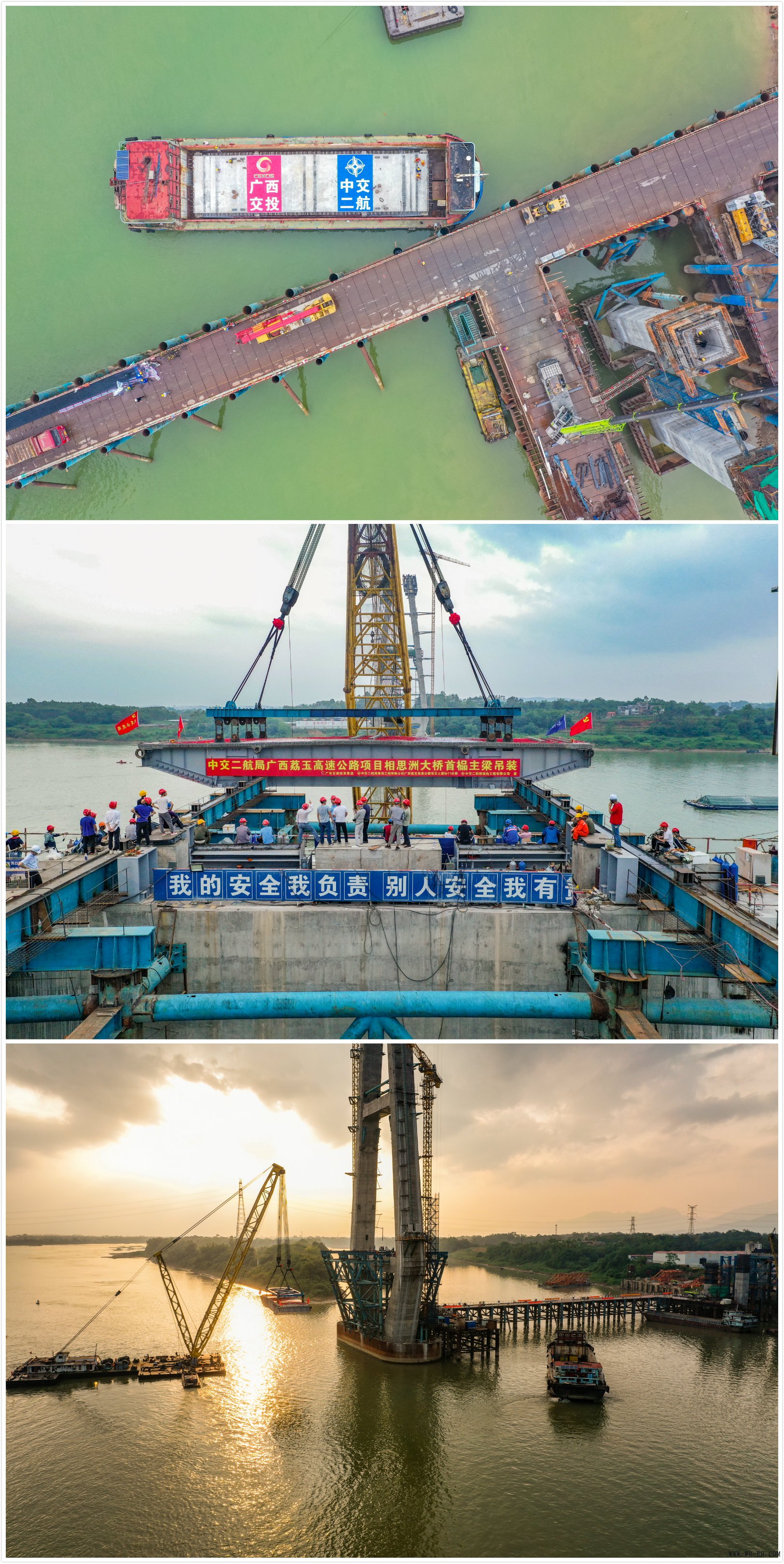5月3日,广西单榀最重钢混组合梁在平南相思洲大桥首次吊装顺利完成,标志着相思洲大桥正式进入主梁安装阶段,为下一步主桥斜拉索安装以及主桥中跨合龙奠定了坚实基础。