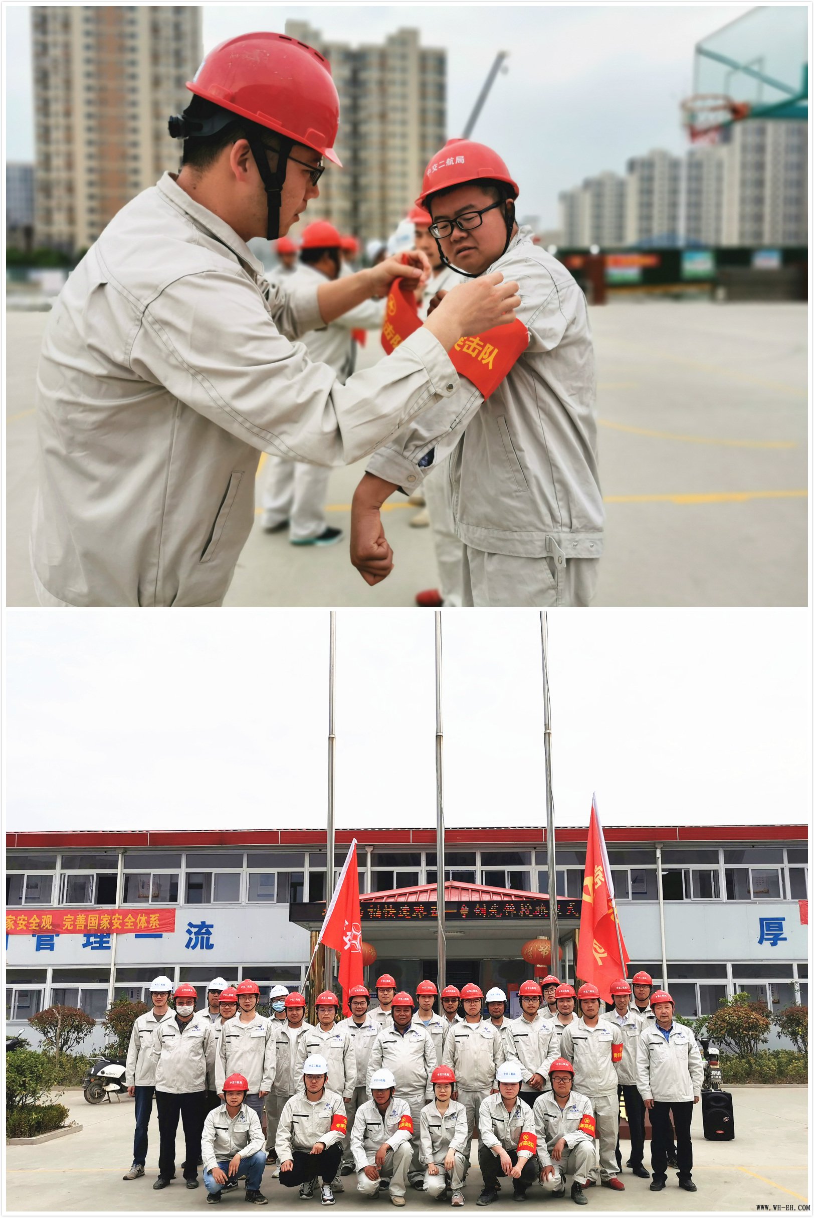 5月1日上午,扬州万福快速路党支部组织开展了青年突击队授旗活动,党支部书记为项目青年突击队进行了授旗,项目领导为青年突击队员佩戴袖标。
