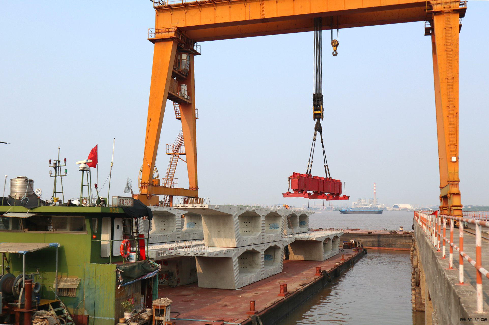 五峰山大桥北引桥公铁合建段公路节段预制梁总长529.1米,设计采用斜腹板单箱双室箱型截面,箱梁采用等高粱,梁高2.4米,主梁单幅顶宽20.24米,底宽11米,单榀最大145吨。