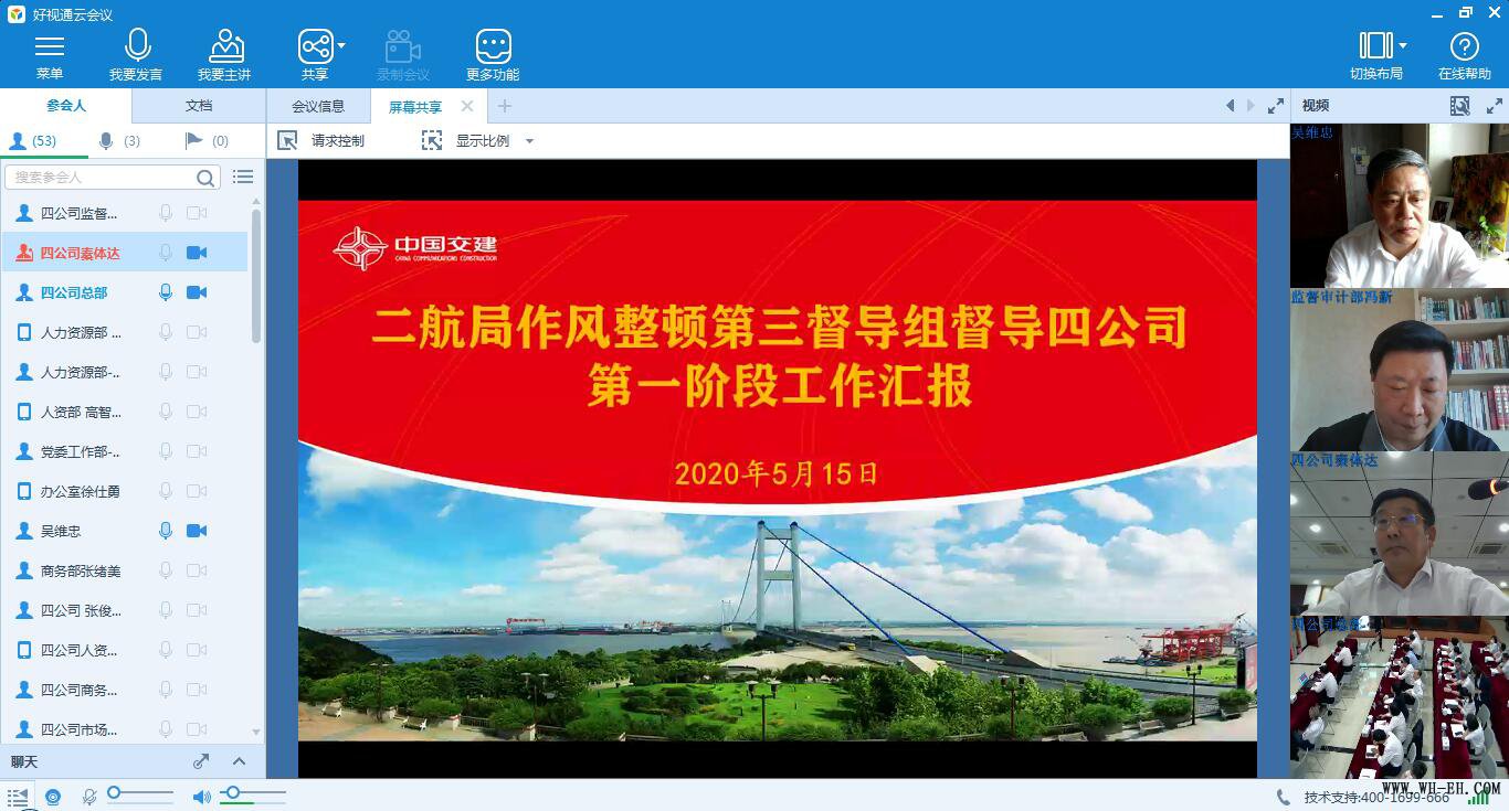 5月15日,中交二航局作风整顿第三督导组组长吴维忠、副组长冯新以及成员陈同尧、陈嘉伦以视频在线方式对公司2020年作风整顿进行第一阶段督导。会议由冯新主持。