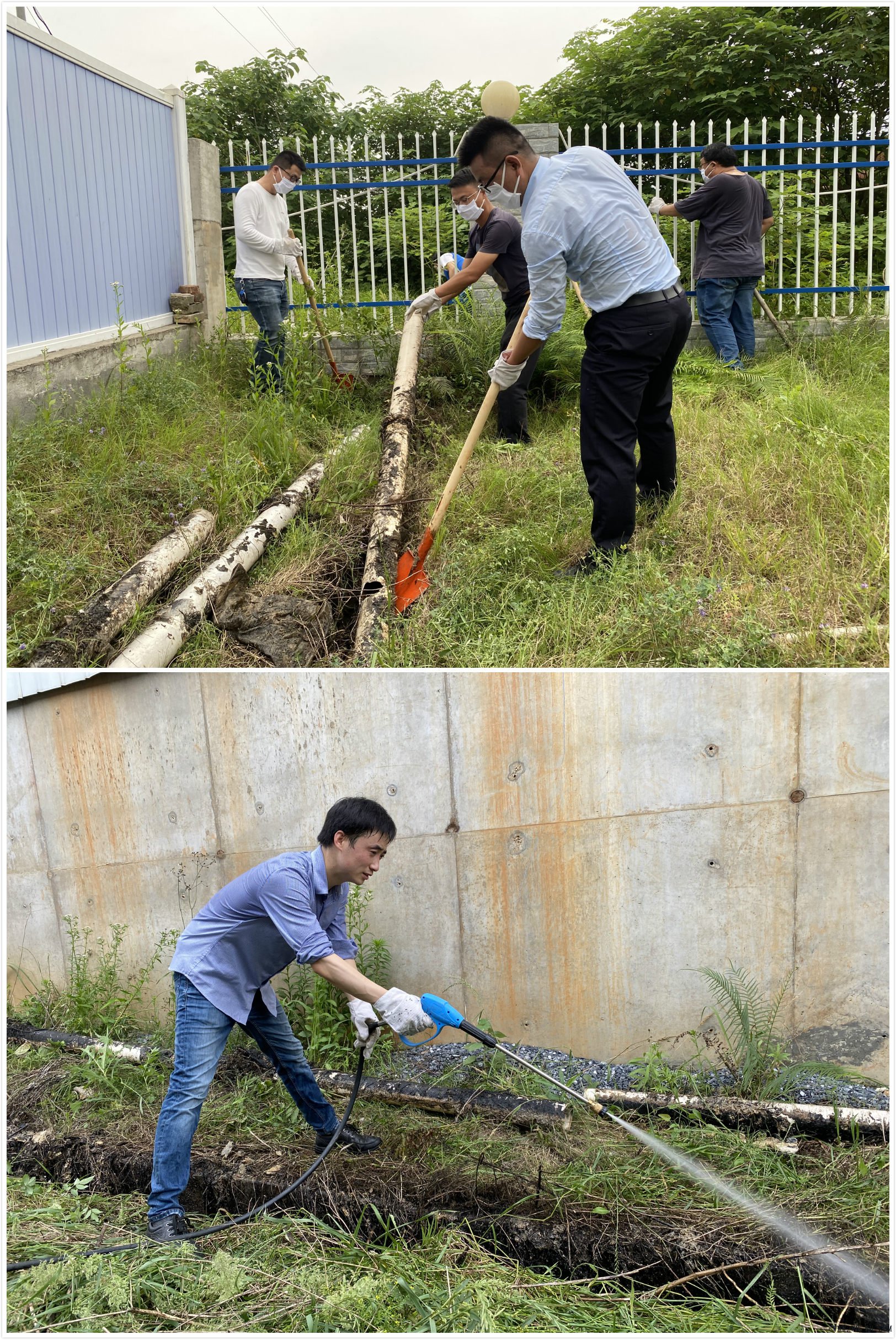本次清扫活动覆盖生活区域后方排水系统的各个卫生死角,并重点处理了项目部厨房以及公共浴室等处的排水口周边区域。而针对其他的垃圾淤泥堆积严重区域,志愿者队伍协同努力,相互配合,将排水沟渠中的废旧管道拆除和转移,分工、分步骤地将该段沟渠清扫、疏通。在埋头苦干的同时,志愿者们还创新工作方法,在清除较重堵塞物体后选择借助洒水车的消防水管来冲扫沟渠。在强劲水流的持续冲击下,整条排水沟渠顿时畅通如初。户外天气炎热,清扫区域垃圾很多且异味难闻,志愿者们在除草清淤过程中,身上都沾满了污水和泥土,汗水甚至浸透了口罩,但是队员发挥艰苦奋斗精神,最终在这场和脏乱环境的“战役”中取得胜利。