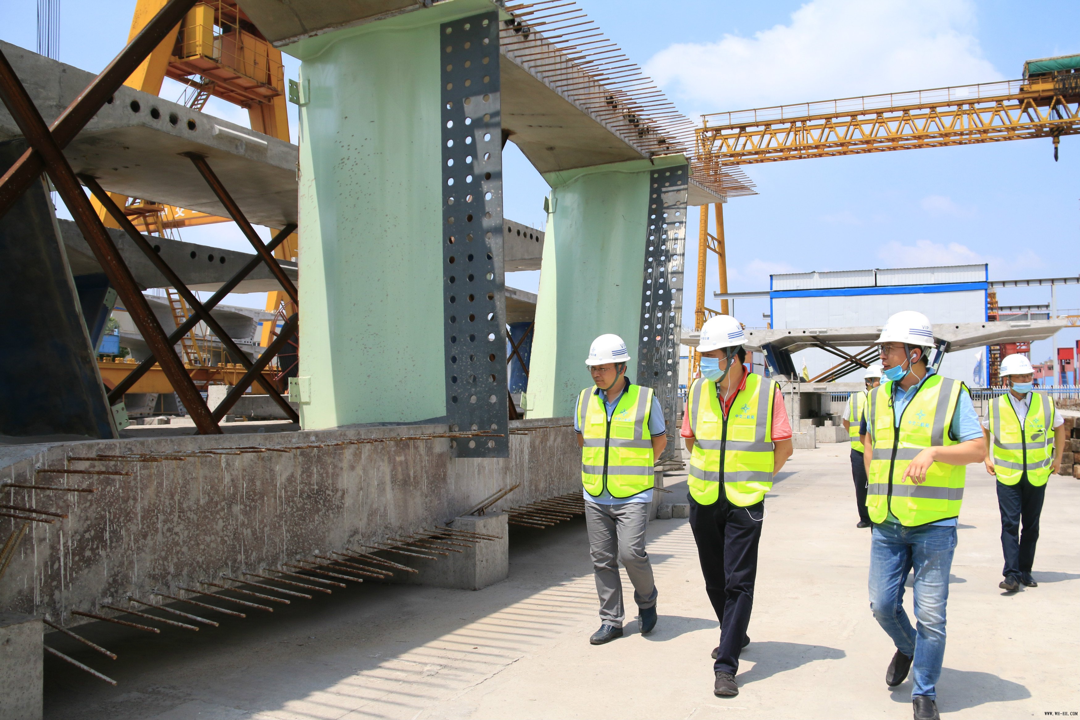 王建平一行首先在构件分公司负责人的陪同下前往现场,实地查看了管片自动流水线生产车间、钢筋配送中心、节段梁生产线及堆存区、出运码头,详细了解了现场安全、技术和文明施工管理情况。在参观“周桥创新工作室”时,王建平对分公司取得的众多创新成果表示了充分的肯定。