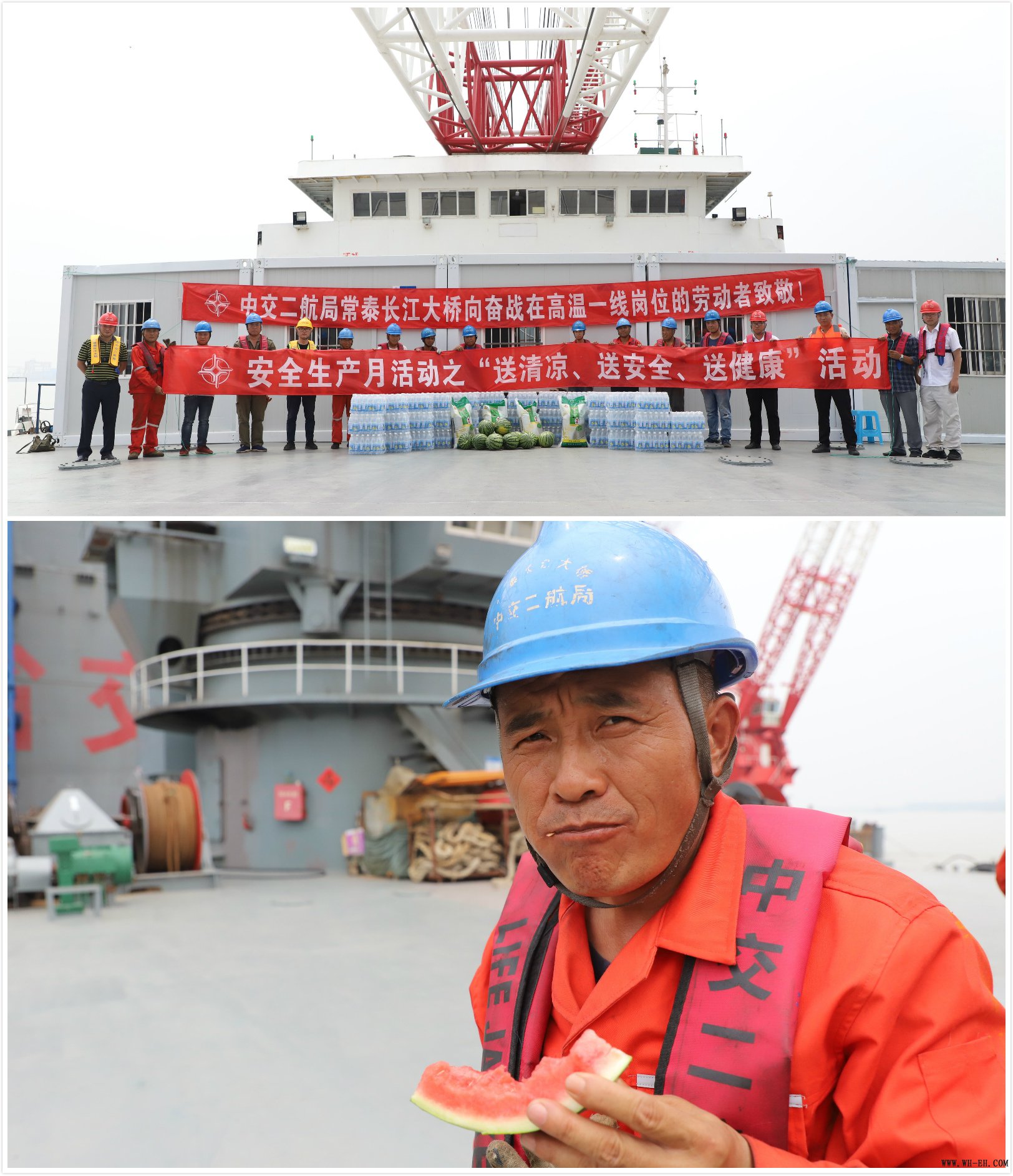 6月10日,为慰问高温天气下的一线建设者们,常泰长江大桥项目部开展了“送清凉、送安全、送健康”的活动。项目生产经理一行人来到了施工一线,为工人们送来了冰镇盐汽水、绿豆、西瓜等消暑降温用品,并对现场施工人员在持续高温天气下工作的敬业精神表示感谢。