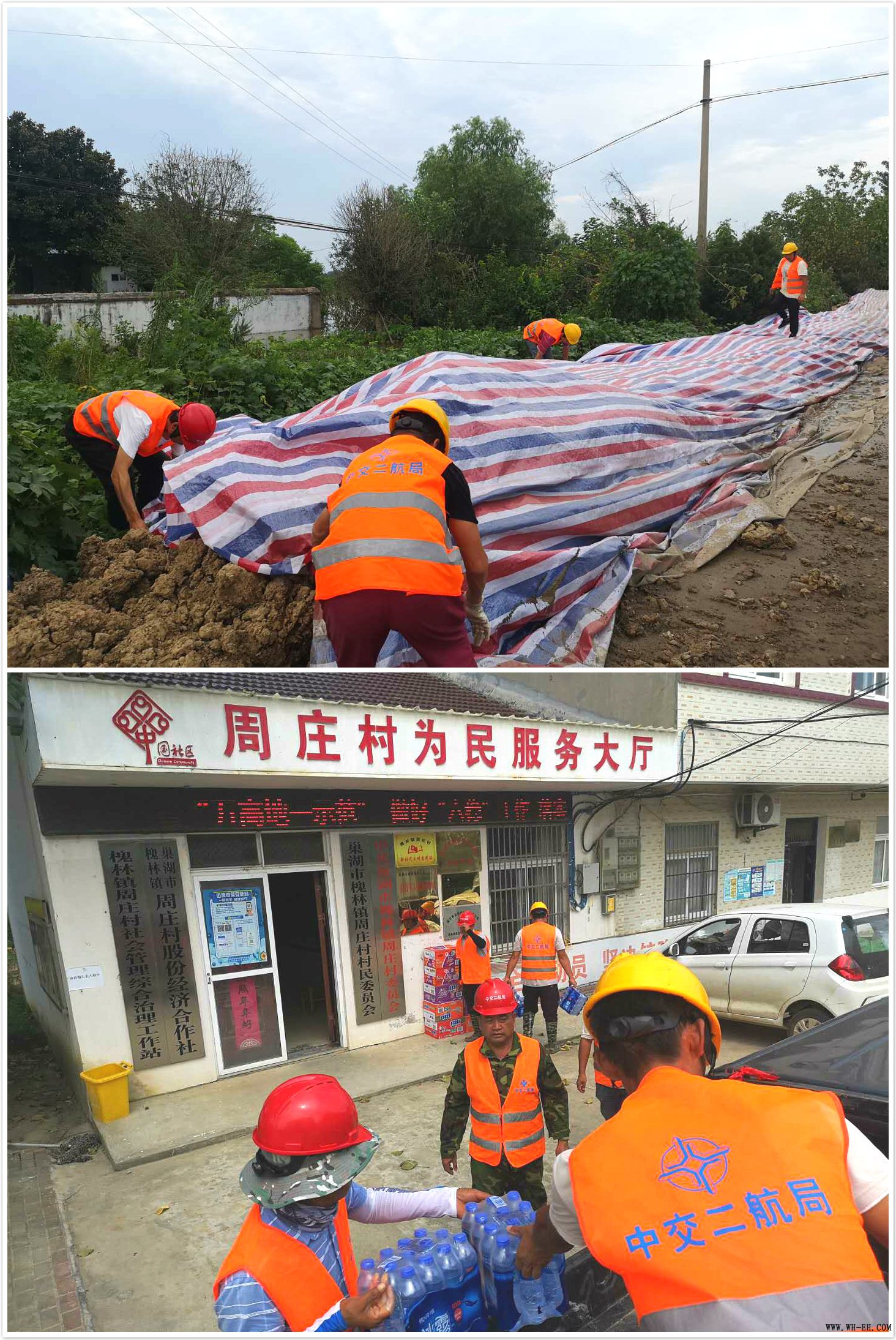 洪水无情人有情,无岳二标项目部了解到标段附近神墩村被洪水淹没情况严重,便立刻积极帮助村民把生产生活用品转移到还未投入使用的钢筋加工厂,把这里作为村民临时安置场所。为了防护兆河大堤,项目人员还和村民们一起装沙袋填充、加高河埂,并调来挖掘机等机械设备对防洪堤进行覆盖维护,同时项目部还紧急采购了一批防汛慰问物资,送到周庄村抗洪一线干部群众手中。为当地防汛尽一份绵薄之力,减轻他们的抗洪压力。