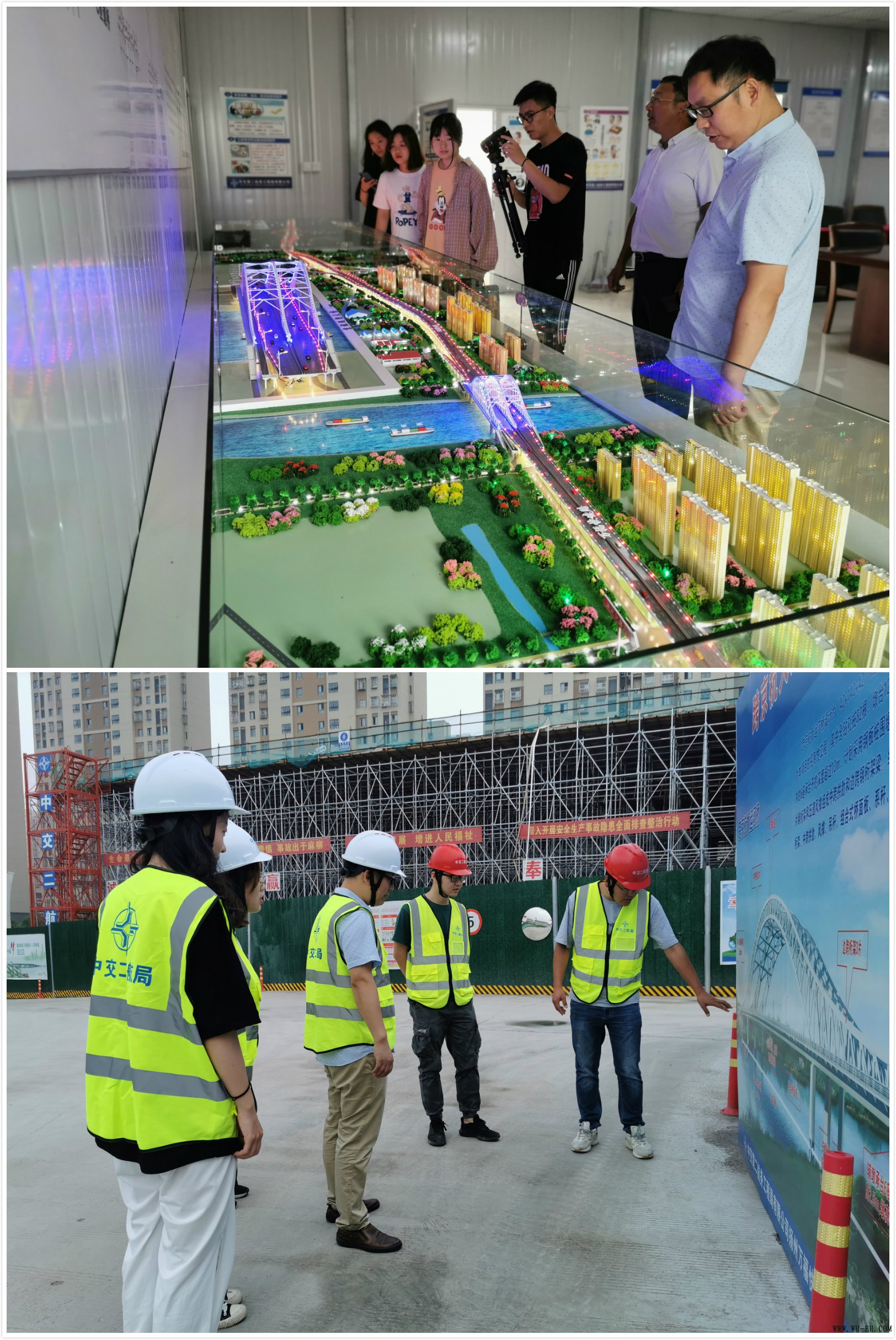 在项目团支部书记公绪向的带领下,师生们带上安全帽,穿上反光背心,先后参观了支架、箱梁、墩柱、京杭运河大桥施工现场。大家还就安全、质量及施工中采用的工艺、材料进行了交流。