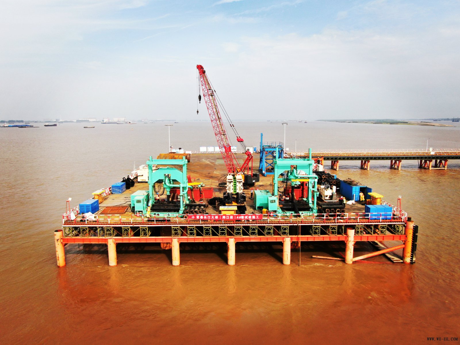 试桩施工是在泰兴侧4号墩栈桥平台处,通过ZJD4000型全液压动力头工程钻机进行钻孔灌注桩施工,试桩结束后,将开展主桥基础钻孔桩施工,进行桥墩建设。