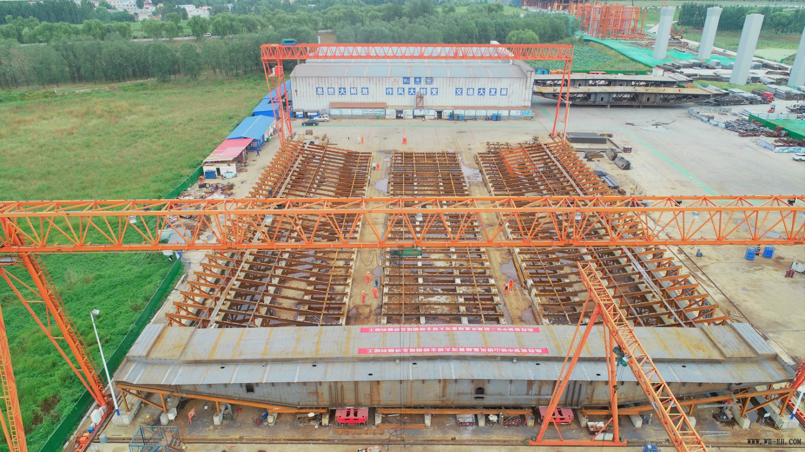 济南凤凰路黄河大桥主桥为三塔自锚式悬索桥,钢箱梁总长1332米,整幅梁宽61.7米,梁高4米,总重约4.71万吨,共分为156个节段,单节段最大重量约400吨。主桥钢箱梁总拼始于2019年9月,至完成历经12个月。