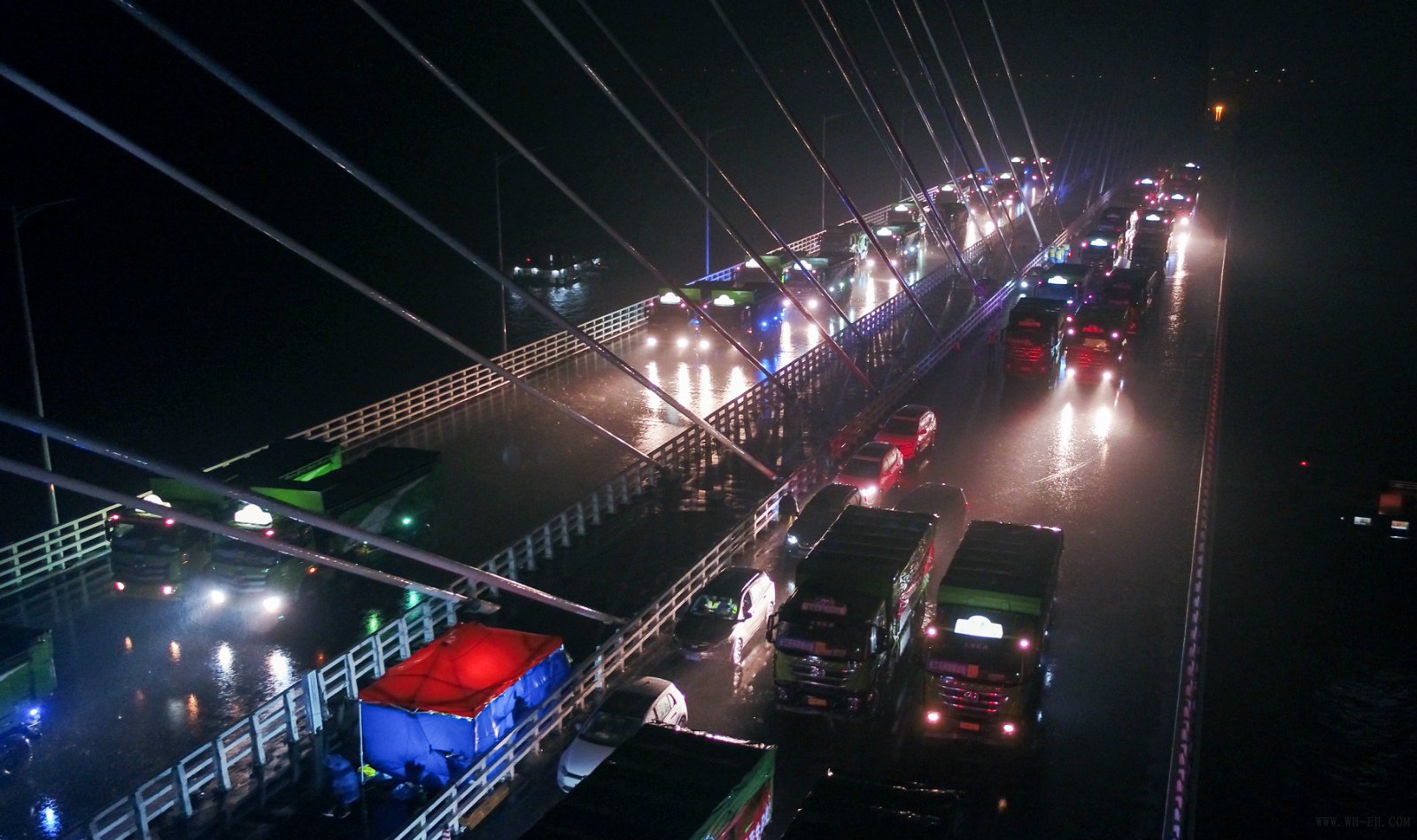 本次荷载试验从10月2日晚开始,历经3天,包含10个静载试验工况,30余个测试项目,分别测试南北两侧各跨主梁L/2截面,L/4截面,3L/4截面及支点截面在车辆对称布载或偏载作用下的主梁应变、梁体下挠、塔顶偏位、斜拉索索力增量等数据。