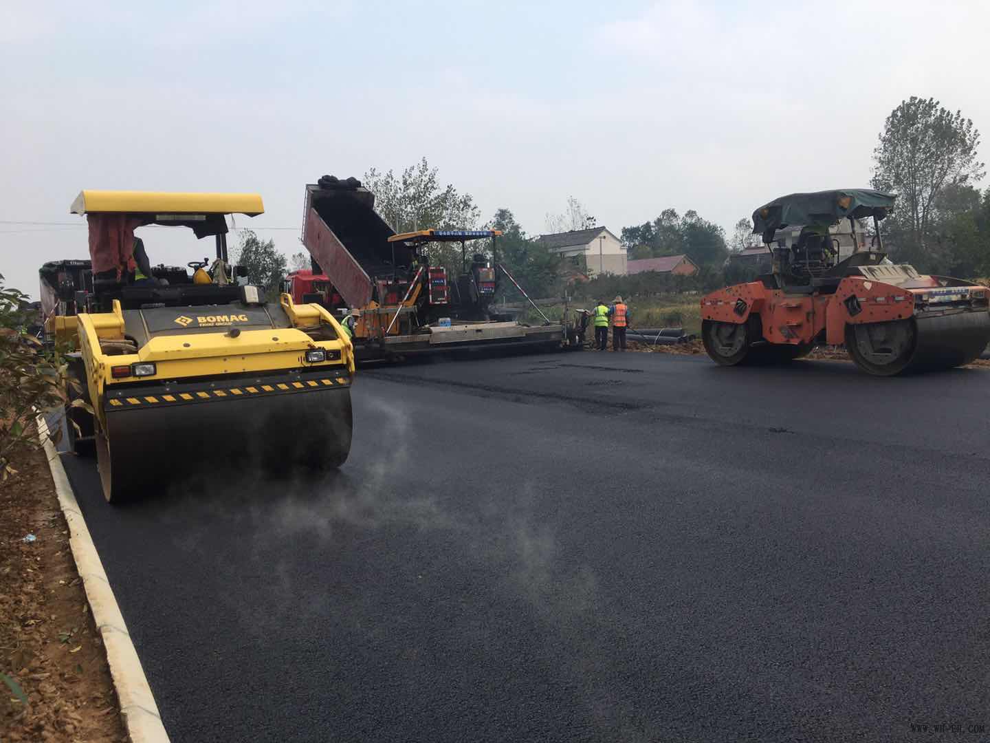 10月12日下午14时,热气腾腾的沥青混合料运至项目金安段现场,沥青上面层摊铺正式开始,沥青摊铺机推着运料车缓缓前行,压路机紧随其后反复碾压。