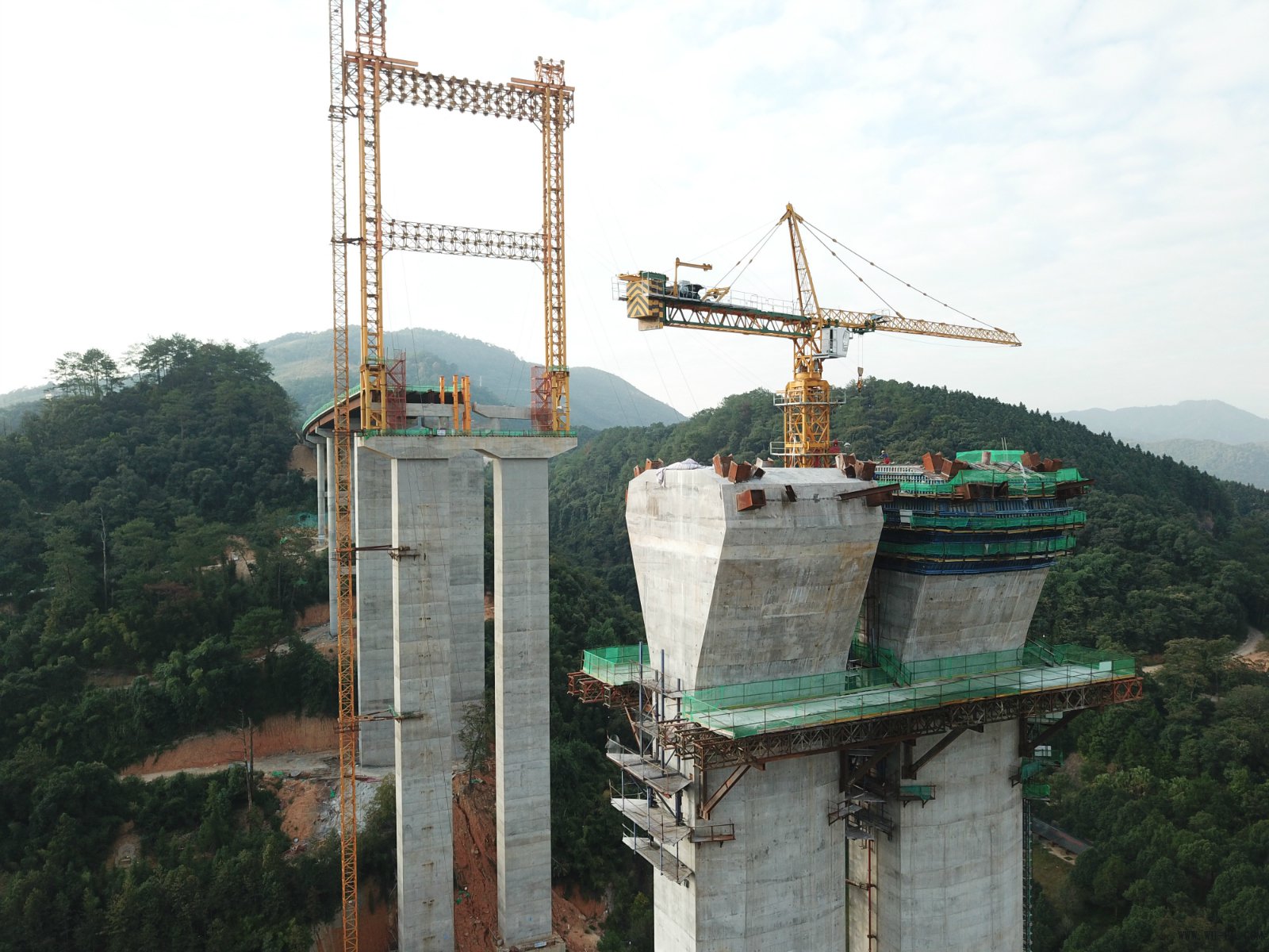 沙溪大桥位于三明市三元区莘口镇,为线路横跨205国道、沙溪河及月亮湾景区而设,施工难度大,高墩施工安全风险高,为莆炎高速合同段全线控制性工程之一。沙溪大桥主桥采用钢桁组合梁连续刚构,下部结构采用空心薄壁墩,右幅桥长1398米,左幅桥长1408米,桥梁宽度33.5米,共有桥墩26个,桩基144根,承台12座。其中,此次封顶的6号墩,墩顶段总高度14米,墩身高度95米。