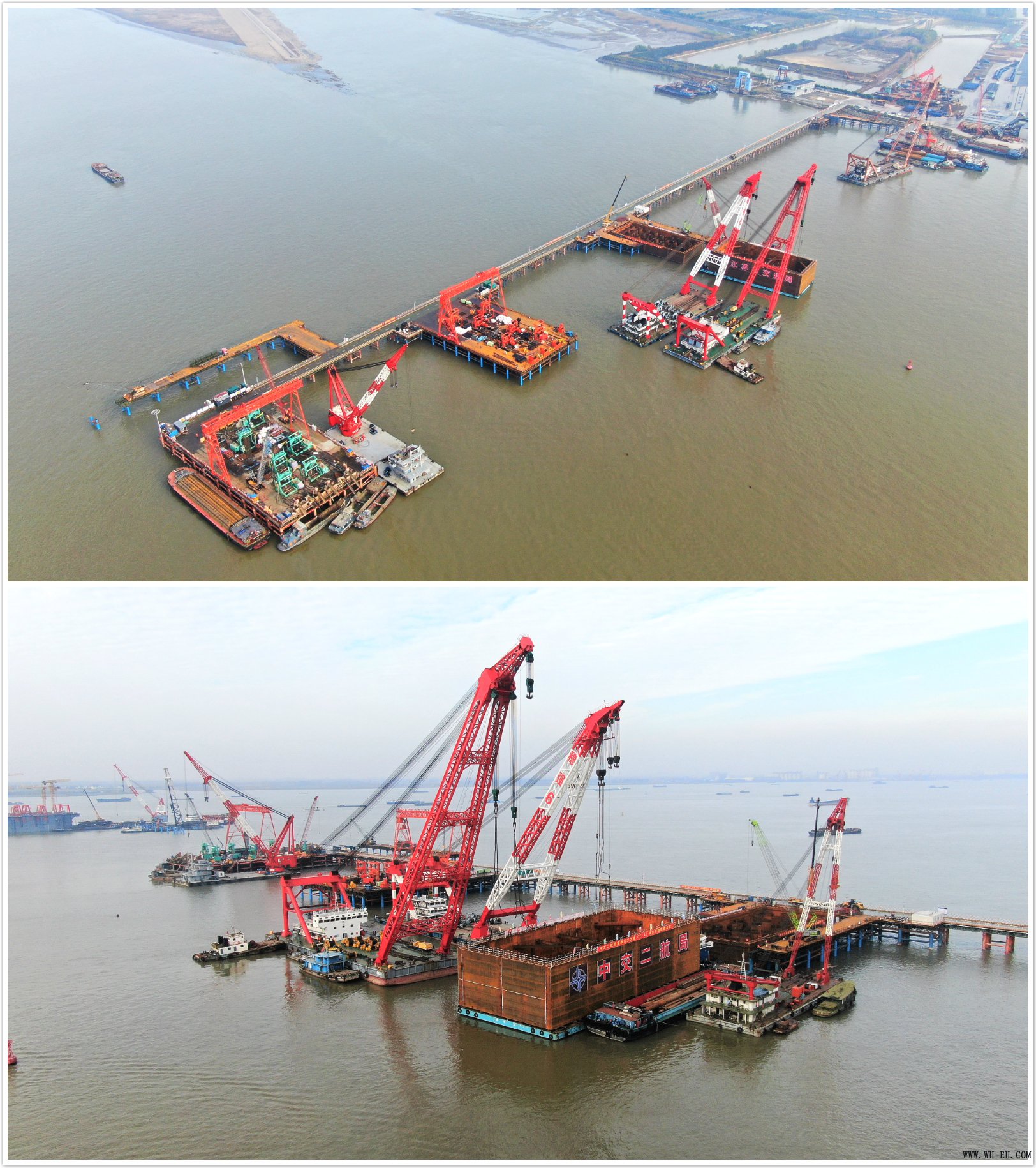 另悉,天星洲航道桥4个墩承台施工均采用双壁钢围堰进行防护施工。钢围堰既是承台施工的挡水结构,还是承台混凝土浇筑的模板,其断面形式与承台平面布置一致。首节钢围堰的成功吊装,拉开了天星洲航道桥桥墩承台施工的序幕,为下一步的围堰接高、主墩封底和承台施工奠定了基础。目前,常泰长江大桥主桥5号墩钢沉井第三次取土下沉已下沉16.35米,累计沉入河床57.64米,姿态良好,即将开始第三次井壁混凝土浇筑工作。