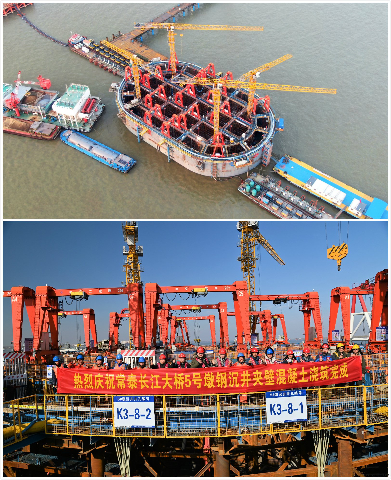 12月15日,耗时13天,世界最大跨度公铁两用钢桁梁斜拉桥——常泰长江大桥5号墩钢沉井浇筑完成第三次夹壁混凝土,这也是沉井最后一次浇筑,距离年底终沉目标迈进了一大步。