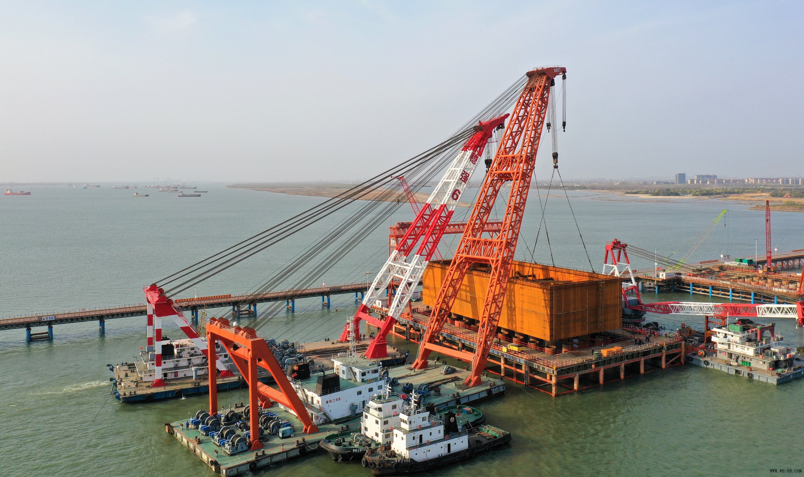 2月24日下午,随着现场指挥的一声令下,两艘浮吊船缓缓吊起重达936吨的4号墩钢围堰顶节,徐徐靠近施工平台,由中交二航局承建的常泰长江大桥4号墩钢围堰顺利吊成功装,标志着大桥4号墩转入承台和塔柱施工阶段。