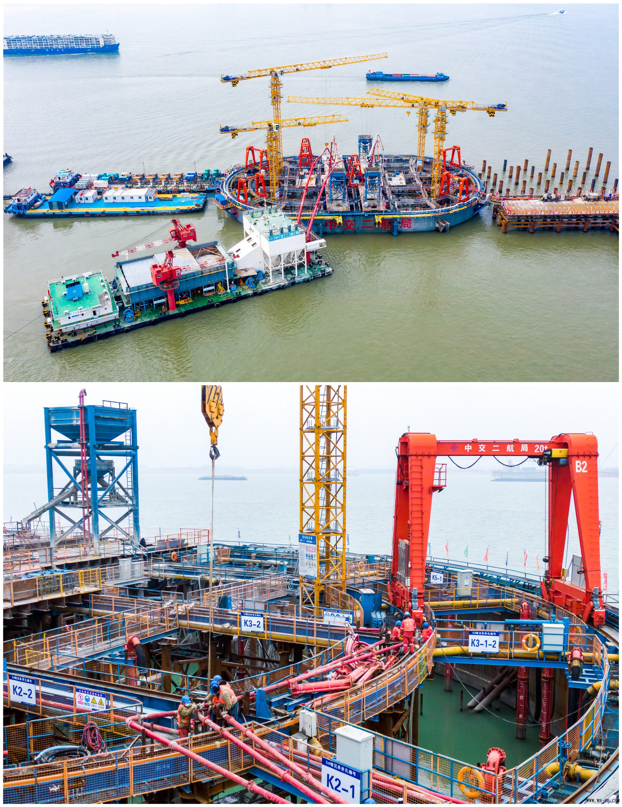 常泰大桥位于泰州大桥与江阴大桥之间,跨越长江连接常州与泰州两市,是长江经济带综合立体交通走廊的重要项目。主桥全长2440米,主跨1176米,为世界最大跨度斜拉桥,大桥建设将实现四个世界首创、六个世界之最。5号墩沉井临近泰兴侧,为新型减自重减冲刷台阶式沉井,平面尺寸长95米、宽57.8米、高64米,有23层楼高、相当于13个篮球场大小,是目前世界在建最大水中钢沉井基础。