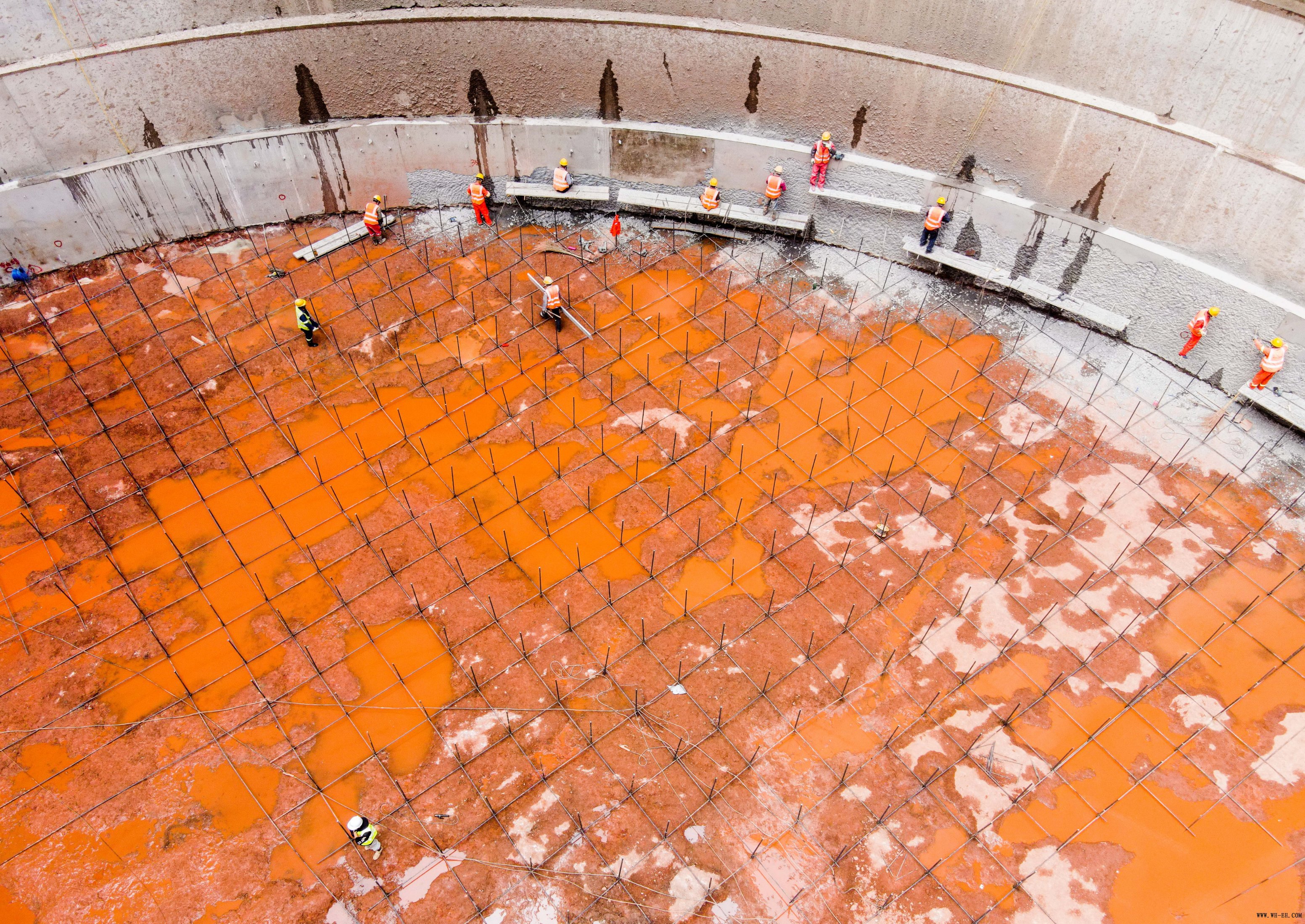 此次施工的底板和填芯混凝土,单次浇筑最大厚度3.6米,浇筑面积1250平方米,最大方量约4500立方米,属于大体积混凝土。由于浇筑方量大、持续时间长、吊装等设备多且存在交叉施工、设备故障风险高、高温天气等因素影响,施工难度较大。目前,施工团队正在科学组织、持续监管现场施工情况,预计两个月完成封底施工。