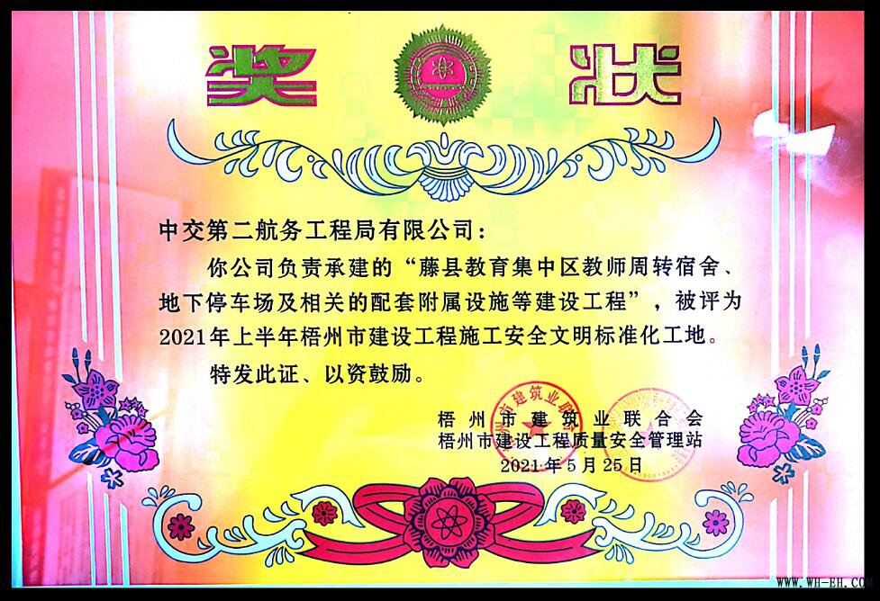 近日,从梧州市建筑协会获悉,由中交二航局承建的藤县教育集中区项目二期工程教师周转宿舍、地下停车场及相关的配套附属设施等建设工程荣获“2021年上半年梧州市建设工程施工安全文明标准化工地”称号。