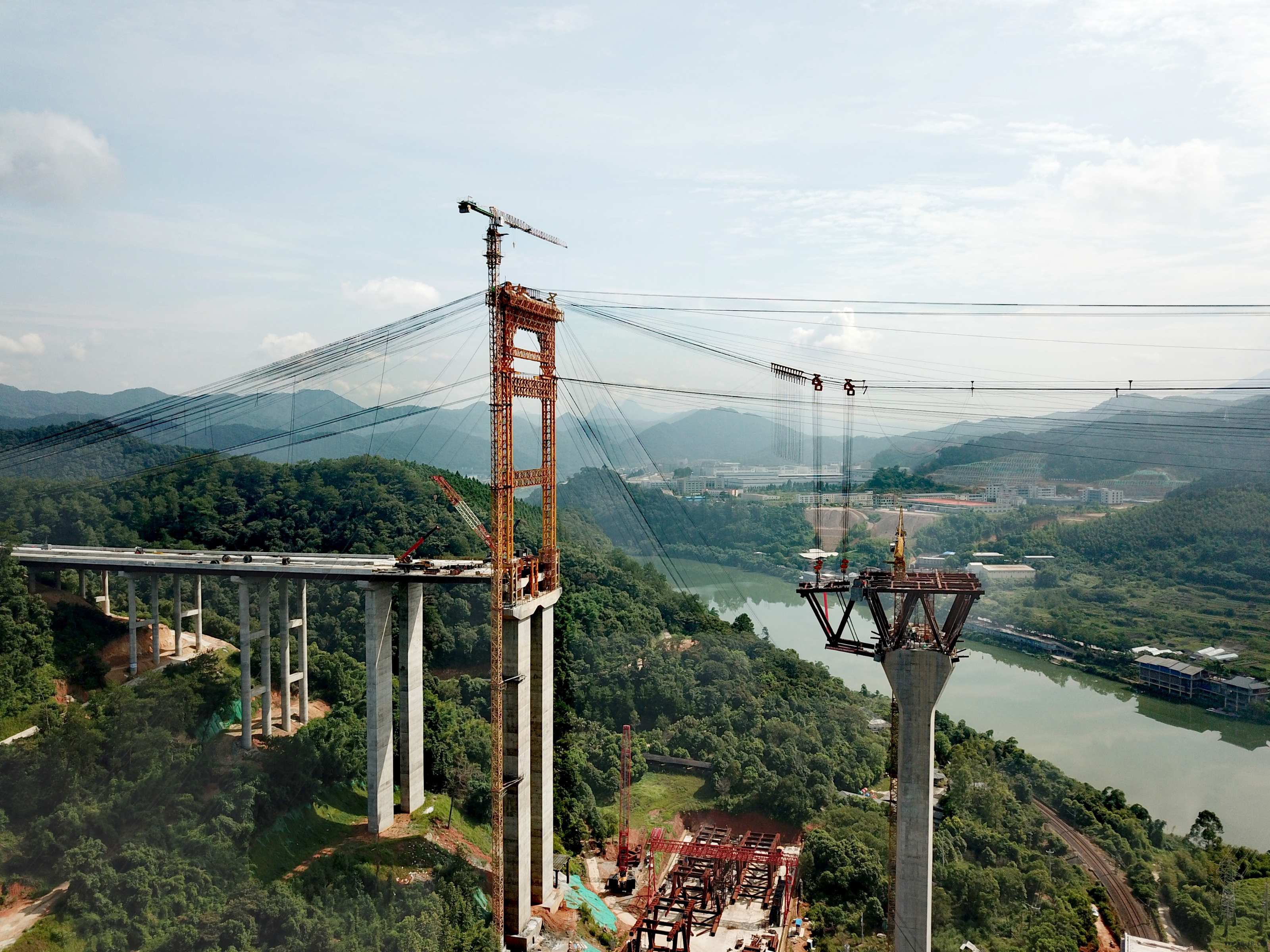 沙溪大桥主桥上部结构主跨采用100 米+176米+176米+100米的钢桁组合连续钢构,为目前国际上同类型桥梁最大跨径。主桥钢桁梁采用缆索吊机进行安装,额定起重量为130吨,钢桁梁节段最大吊重为103吨。此次吊装的钢桁梁节段重达97吨,将安装在主桥6号墩约95米高的预定位置。