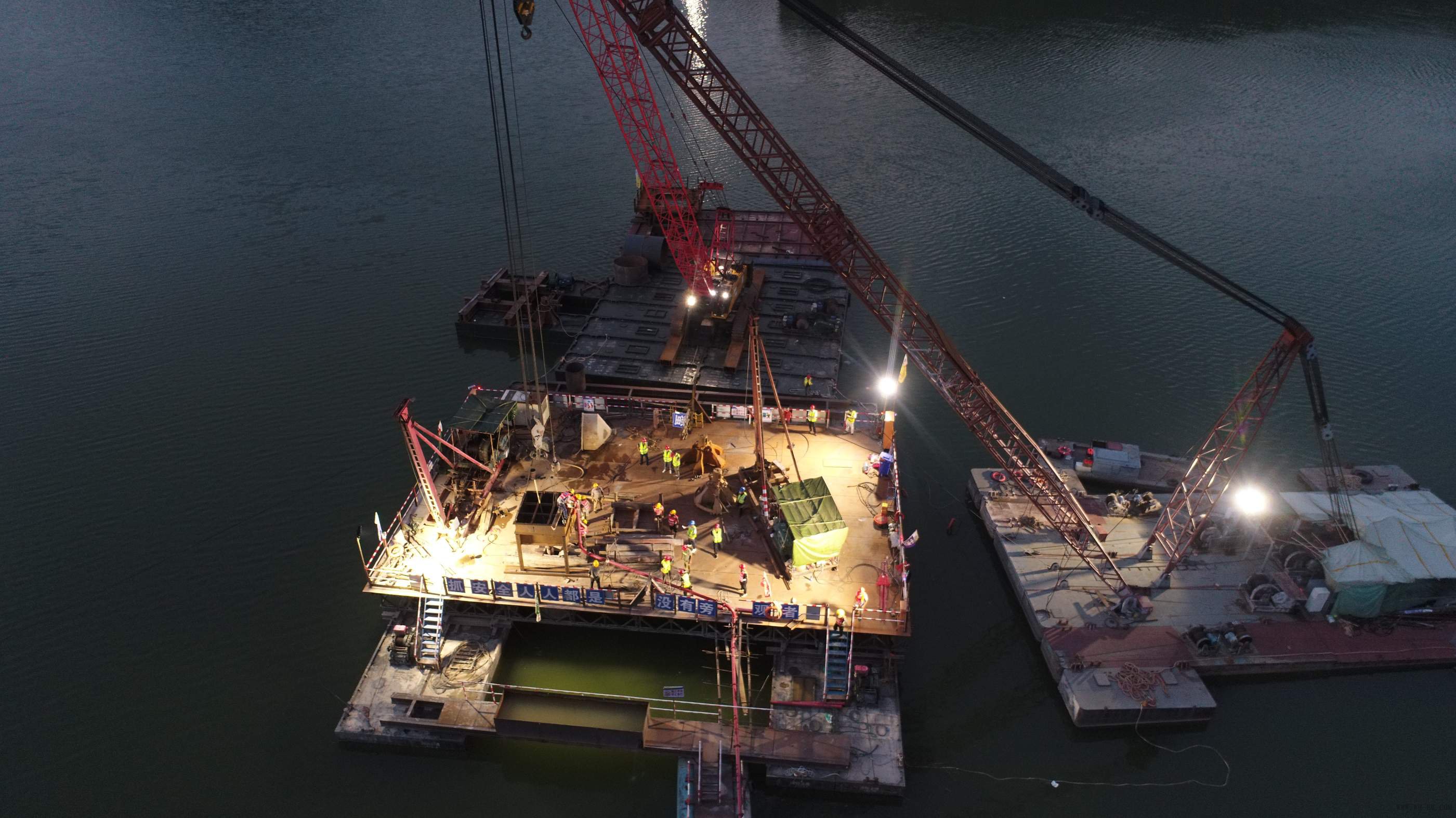 八渡三桥全长365米,位于水电站库区,设计最高水位307米,最低水位291米,预计年水位差16米左右,最大水深可达46米,相当于16层楼的高度。其施工工艺复杂,技术难度大,安全风险高,是本项目的关键控制性工程。其中2号主墩采用整体式承台+嵌岩群桩基础,由9根直径为2.2米群桩组成,桩基持力层为中风化砂岩,采用C30水下混凝土。为保障首桩浇筑的工作质量及安全,项目部根据建桥条件、施工工艺、施工方案等情况,制定了2号主墩采用浮式平台的施工方案。