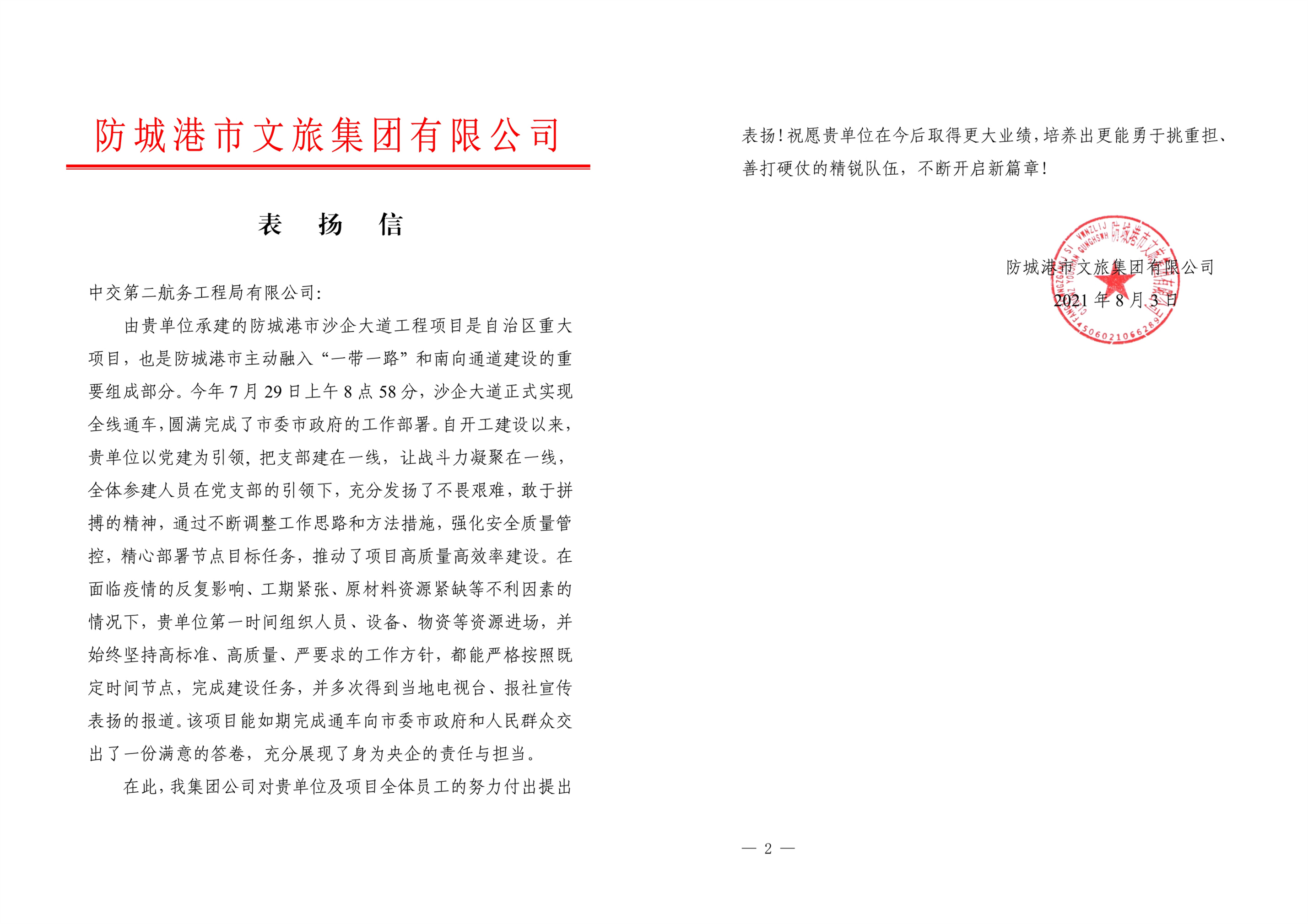 近日,公司防城港市沙企大道工程项目顺利实现全线通车目标,圆满完成了市委市政府的工作部署,得到业主的高度认可和赞扬,并收到表扬信。